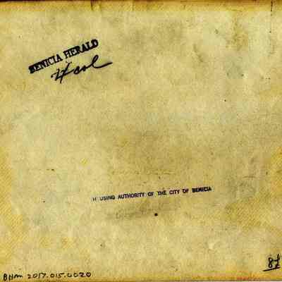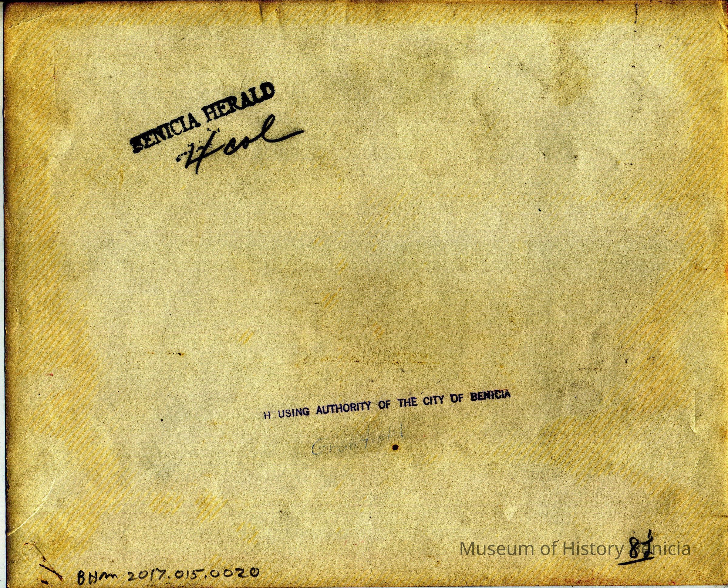 Photo of Thomas Wright with a group of others at a table. The back of the photo shows this as a Benicia Herald photo and that it is of the Housing Authority of the City of Benicia.Collection