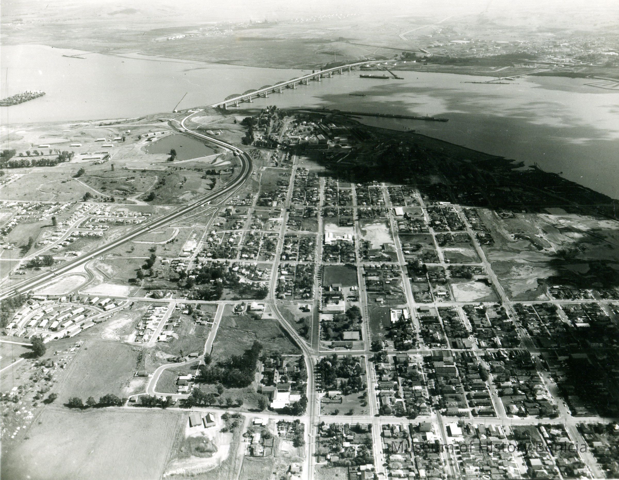 B/W aerial view of arsenal showing Benicia-Martinez Bridge.