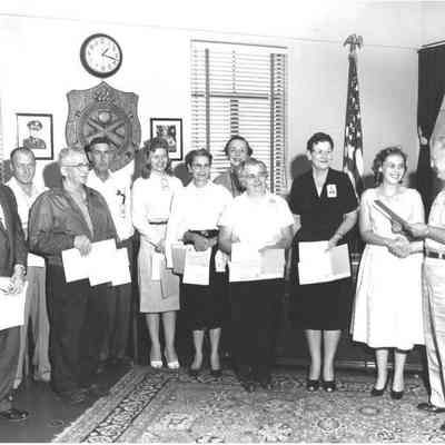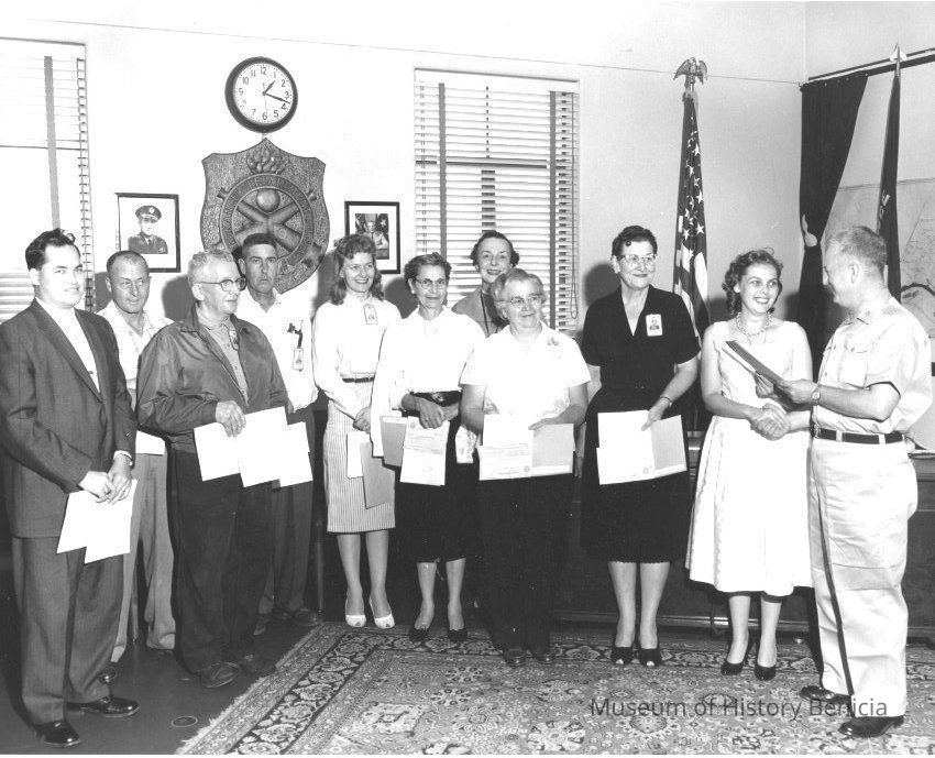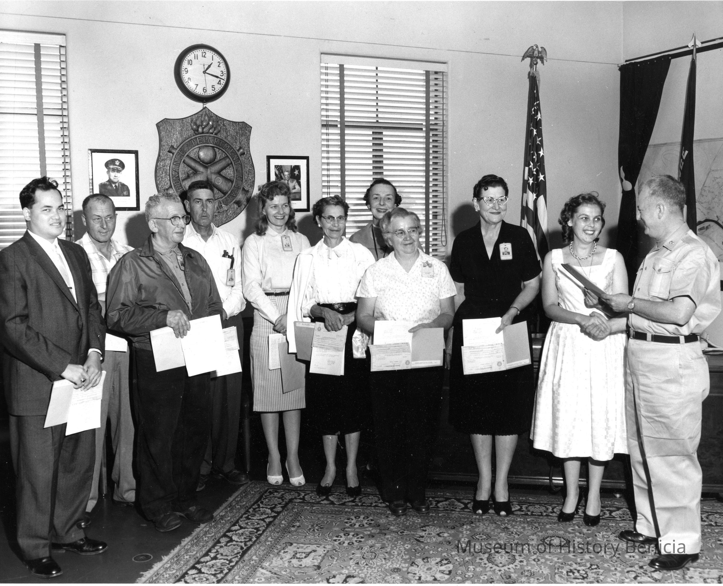 Photo of Mildred McClain Miller and others receiving awards. Probably at the Benicia Arsenal. Mildred is the 4th woman from the right.Collection
