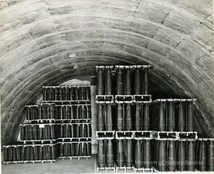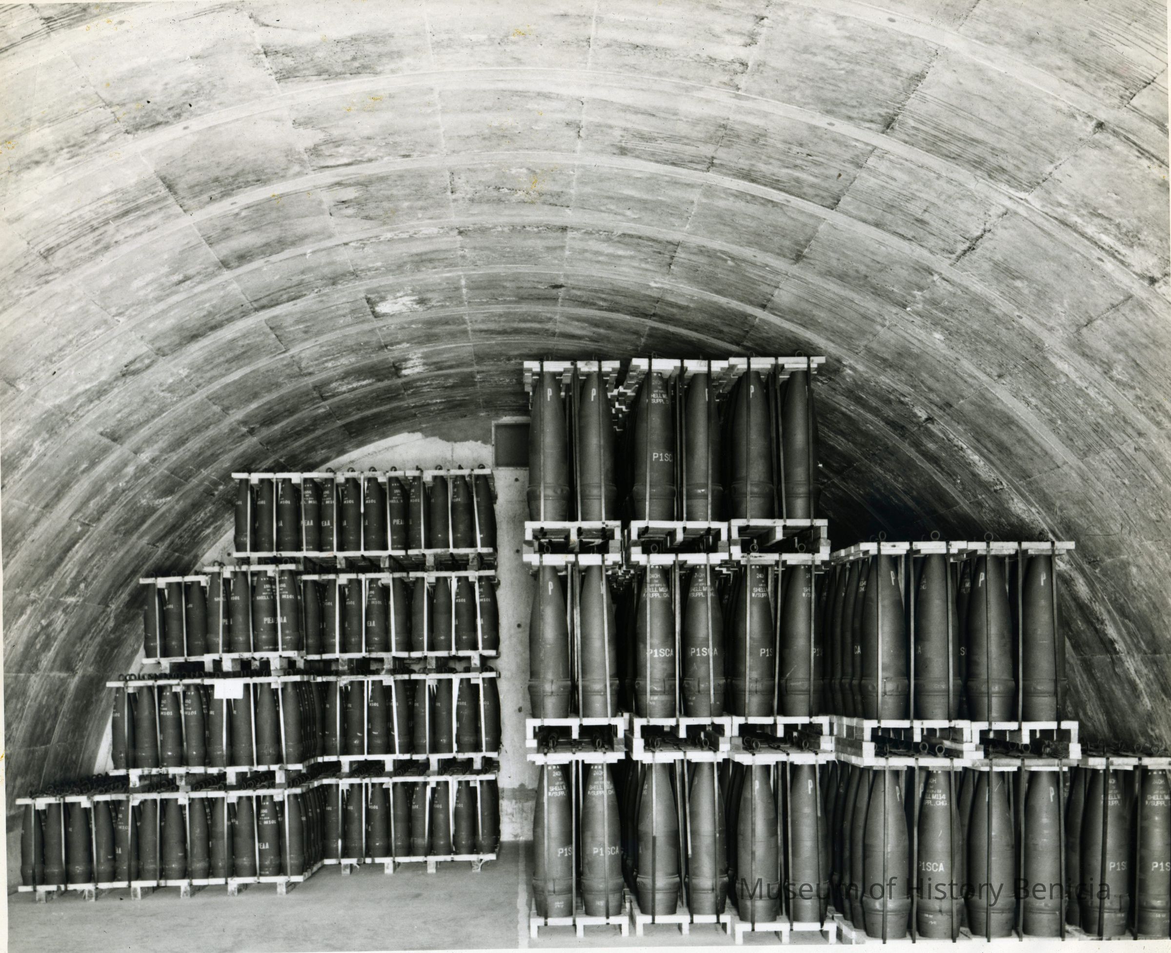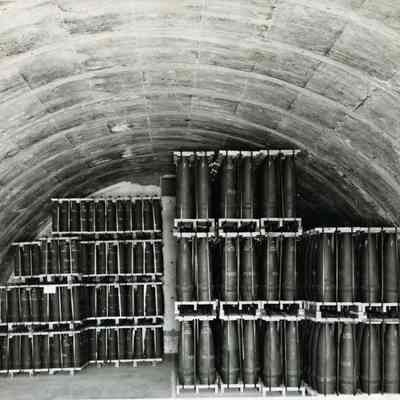 Photo from the Josephine Cowell research material. Shows the interior of an igloo at the Arsenal filled with shells.