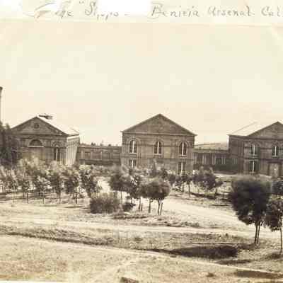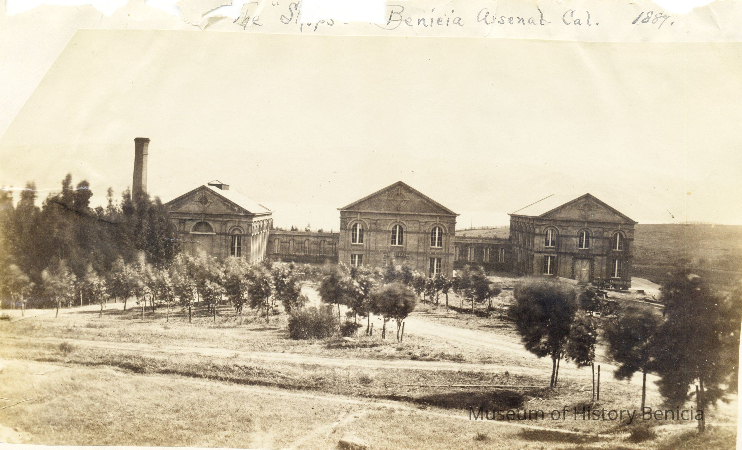 The other photo is of the "shops" (machine shops) at Benicia Arsenal in 1887. It shows the three brick buildings with nothing but trees in front of them.Collection