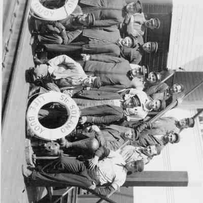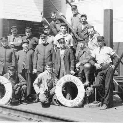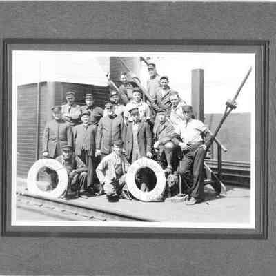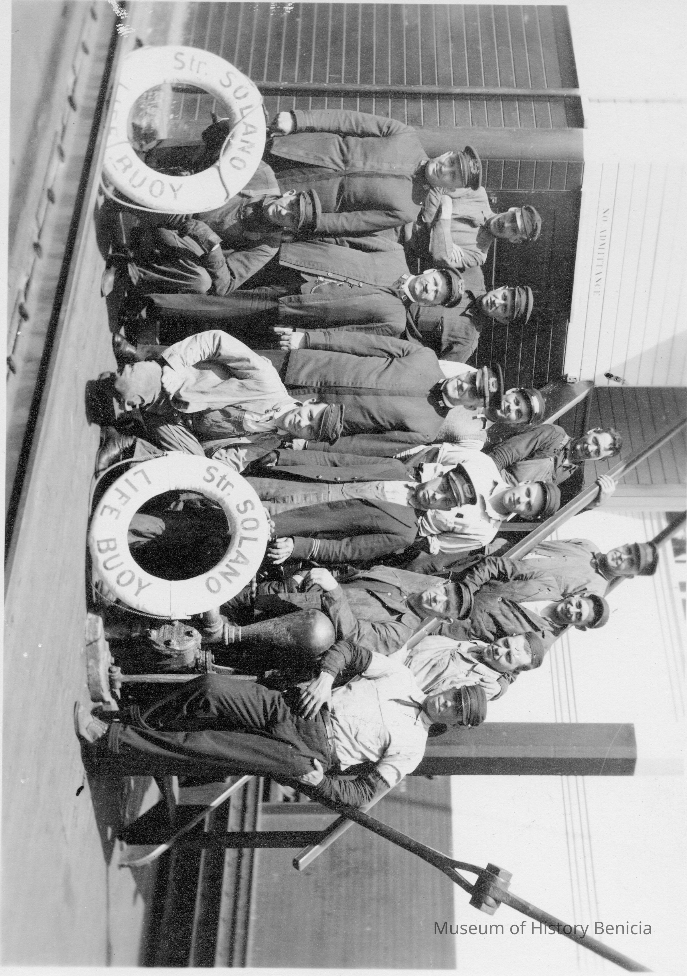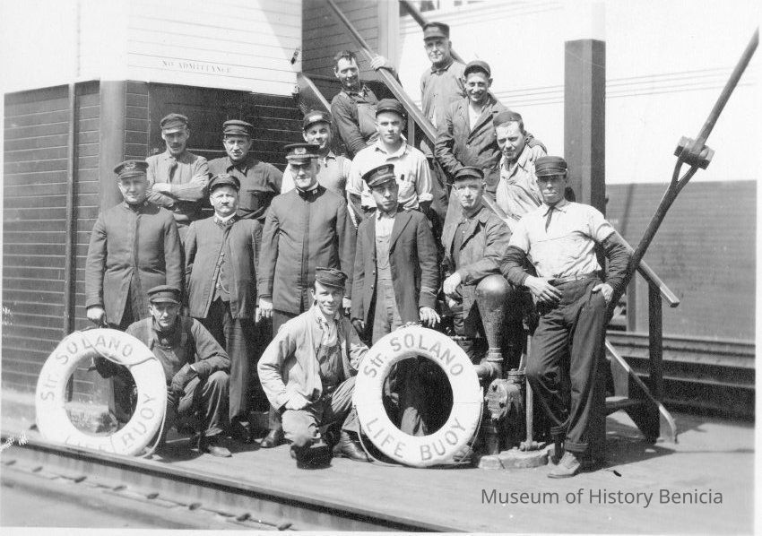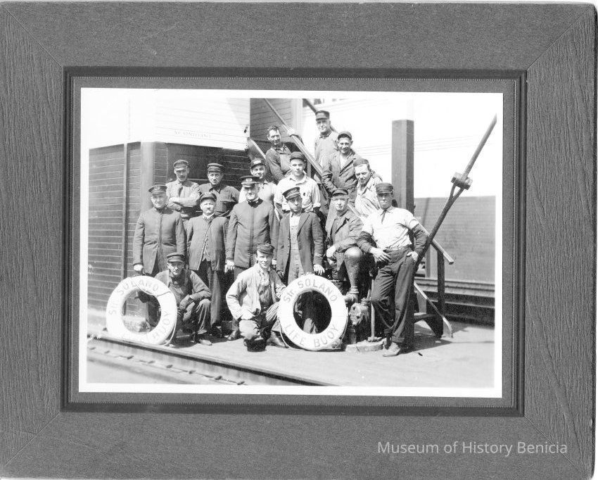B&W photo of the men working on the Solano Ferry, built in 1879. The back says property of Mary Casey 157 E "G" Bene". Harry Wassmann says that the man 2nd from the right in the first row standing is Mr Wilkie. Mr Wilkie was the grandfather of Mary Casey.Collection