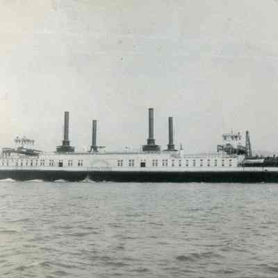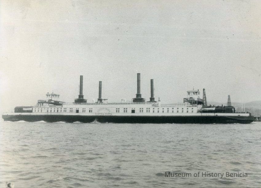 Ferry boat "Contra Costa" approaching Benicia dock. B/W photo.