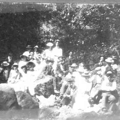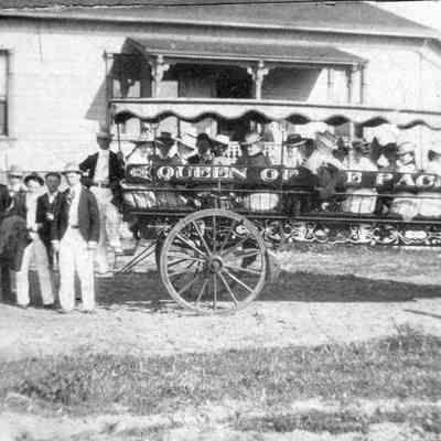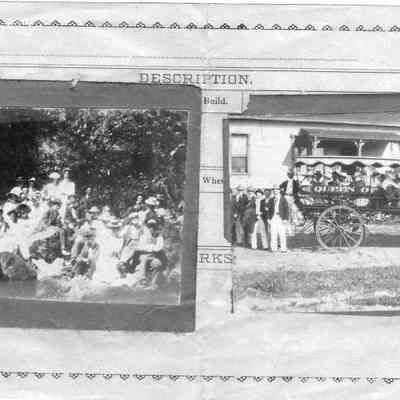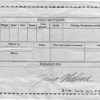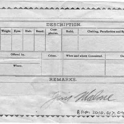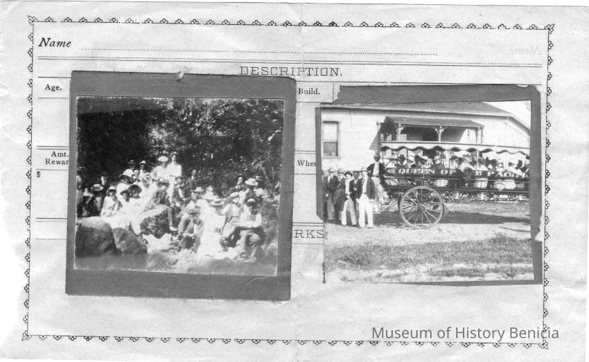 Two photos. One is of people on a rock next to a stream or pond. The other is of people in a buckboard with "Queen of the Pacific" on the side. The photos are pasted to a form used to describe people who had committed a crime. It asks for reward amount and physical description of the person.
