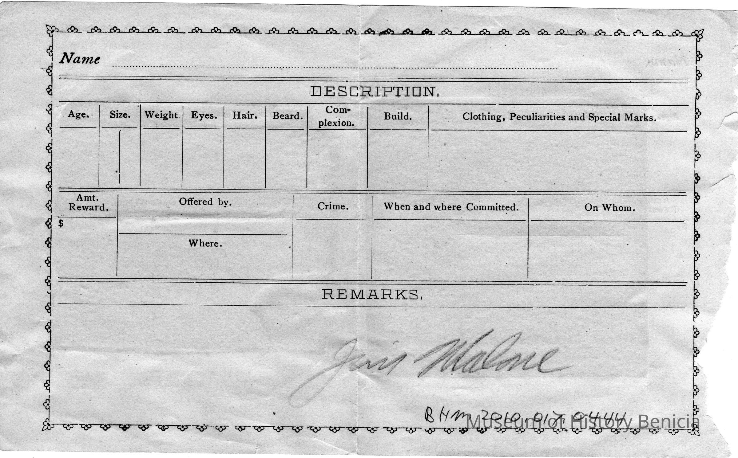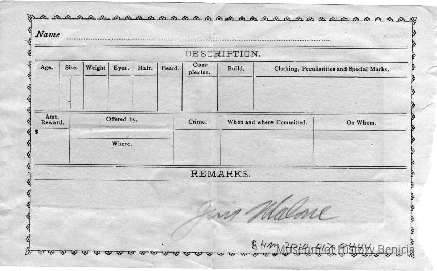 The name Jim Malone is written in pencil. This could indicate who owned the item. It may also have something to do with the fact that Jim Malone was the Solano County Sheriff at one time in the early 1900's.Collection