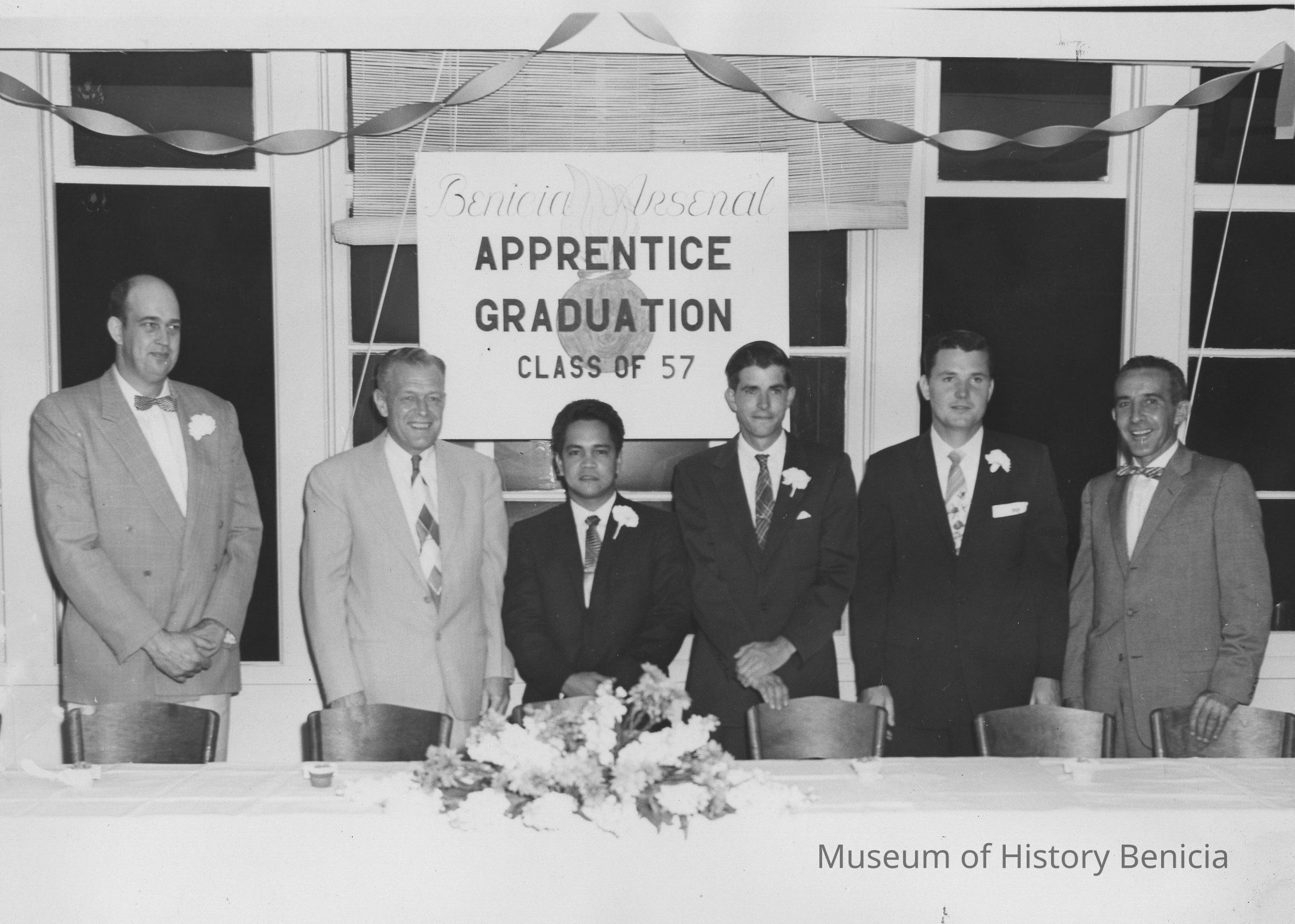 B/W Photograph: six men in suits behind table. Sign behind reads: "Benicia Arsenal Apprentice Graduation Class of '57".