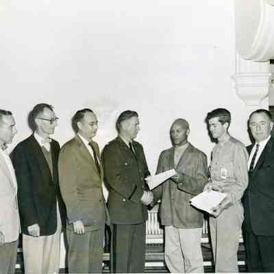 Lt. Col. Schmidt presenting certificate of training completion to employee of Maintenance Division. John Power