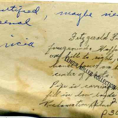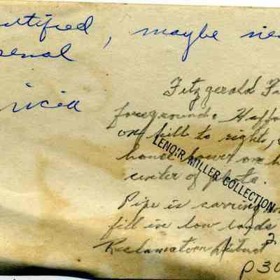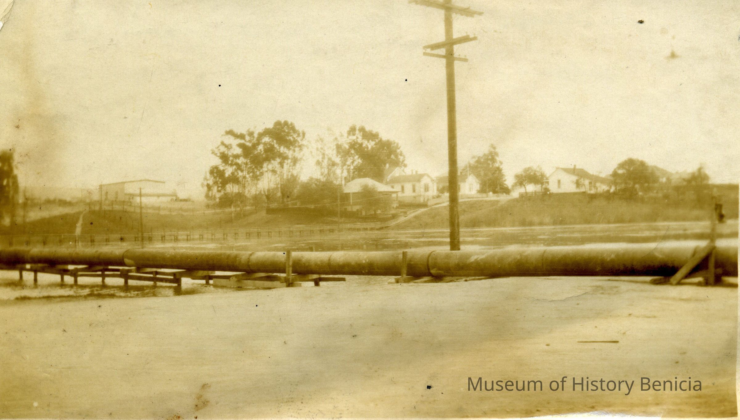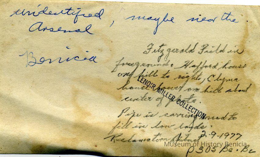 Photo of a pipe near Fitzgerald Field in Benicia. Two notes on the back. One is maybe from Lenoir Miller saying this is "unidentified, maybe near the Arsenal". The other is in Harry Wassmann's hand and says: