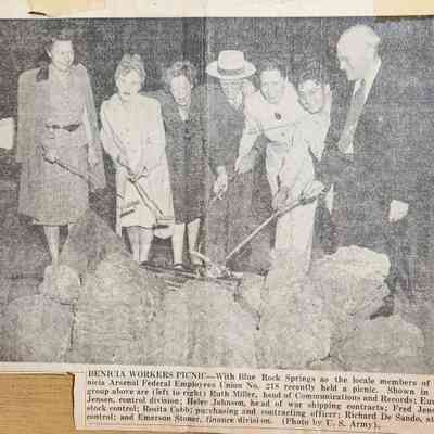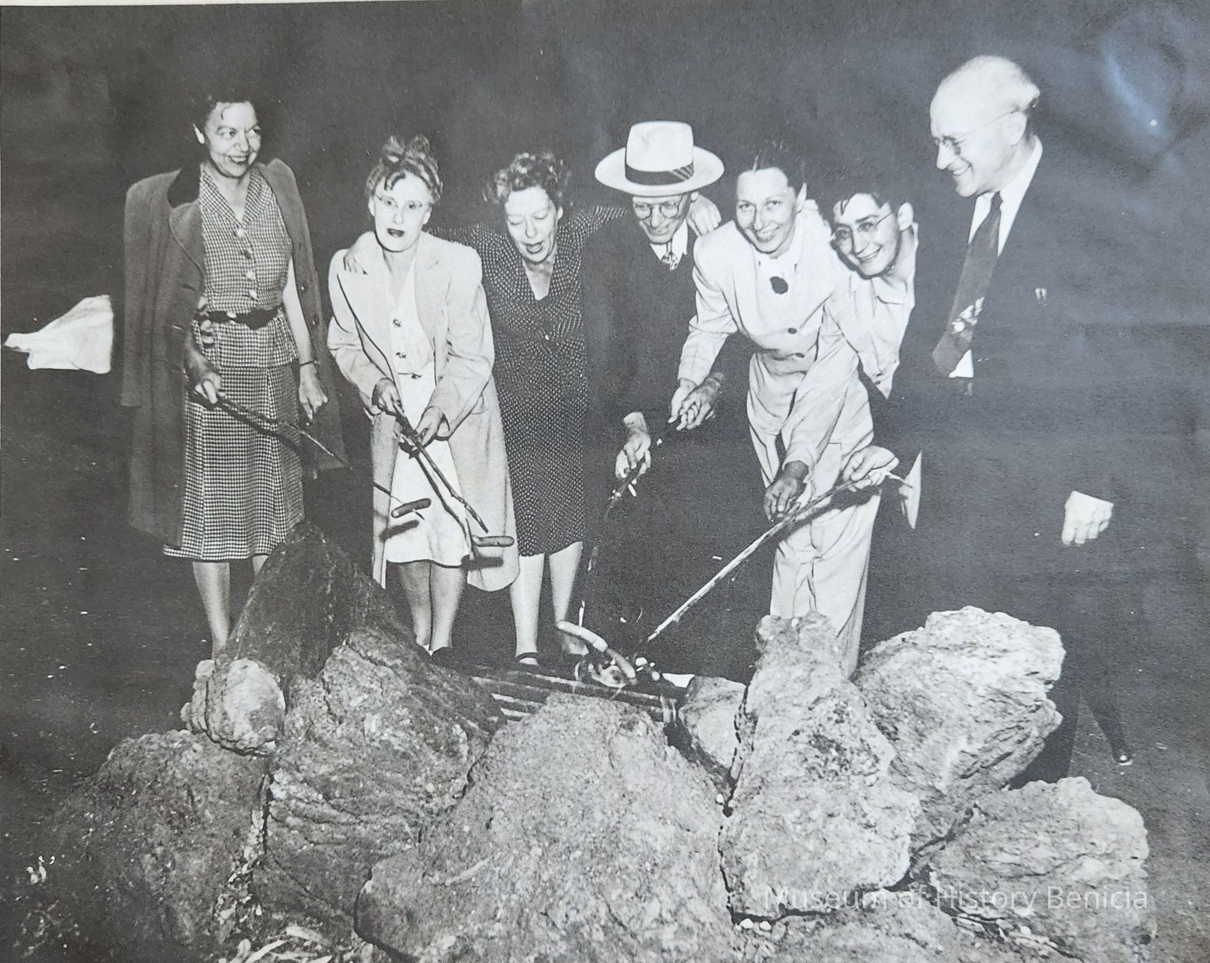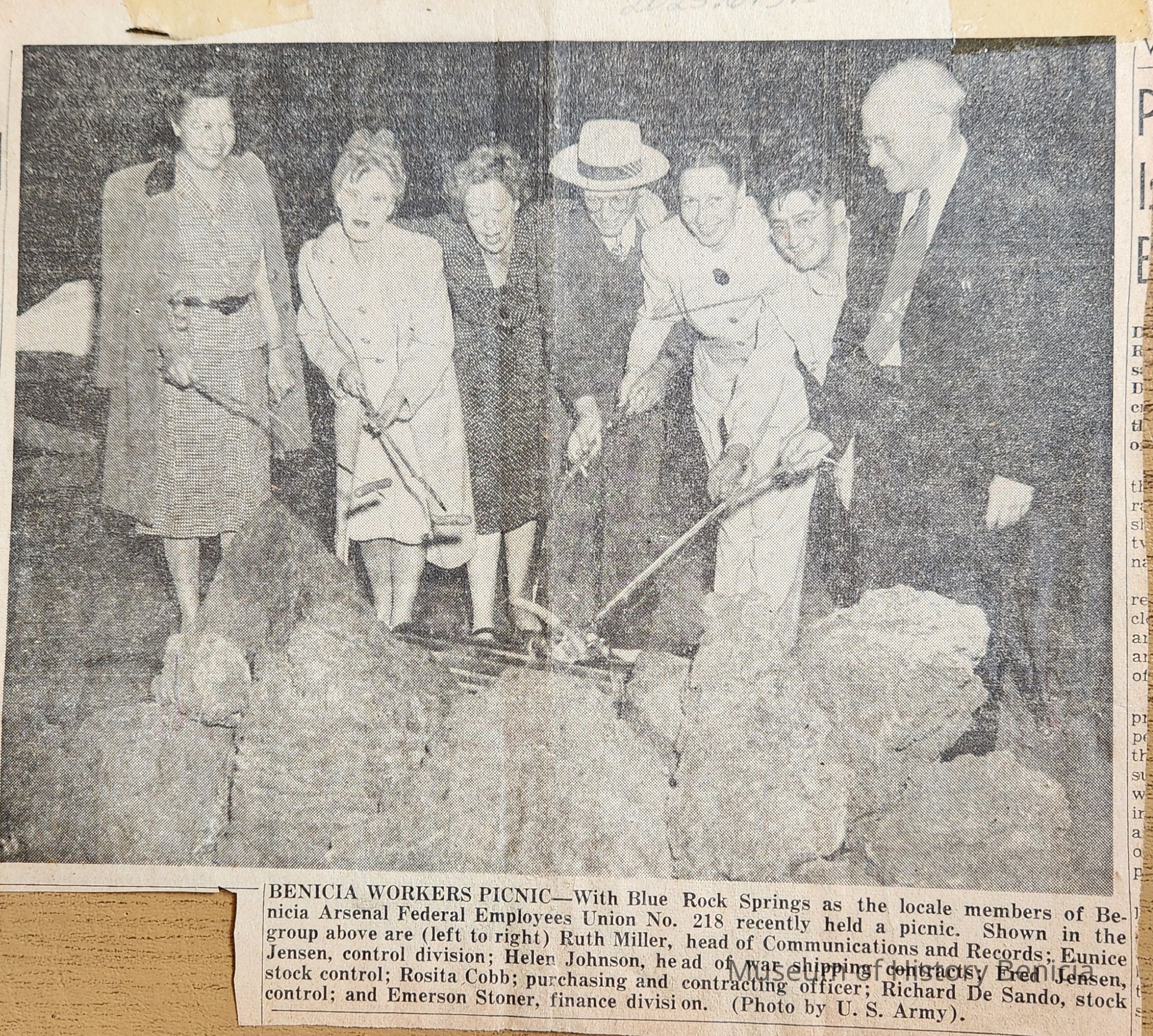 B/W Photograph of seven people at Blue Rock Sprints where some members of the Benicia Arsenal Federal Employees Union No. 218 held a picnic. Left to Right: Ruth Miller (head of communications and Records); Eunice Jensen (control division); Helen Johnson (head of war shipping contracts); Fred Jensen (stock control); Rosita Cobb (purchasing and contracting officer); Richard De Sando (stock control); Emerson Stoner (finance division). They appear to be roasting hot dogs over a fire pit.Collection