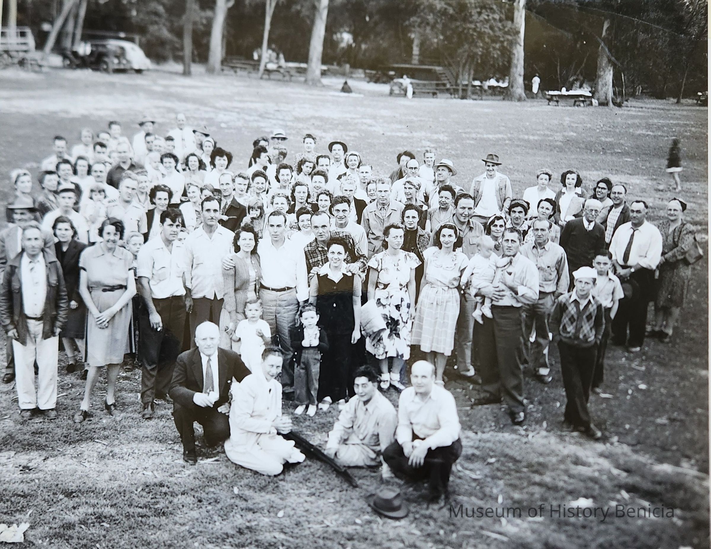 B/W Photograph of a group of people, members of the Benicia Arsenal Federal Employees Union No. 218, at a picnic at Blue Rock Springs