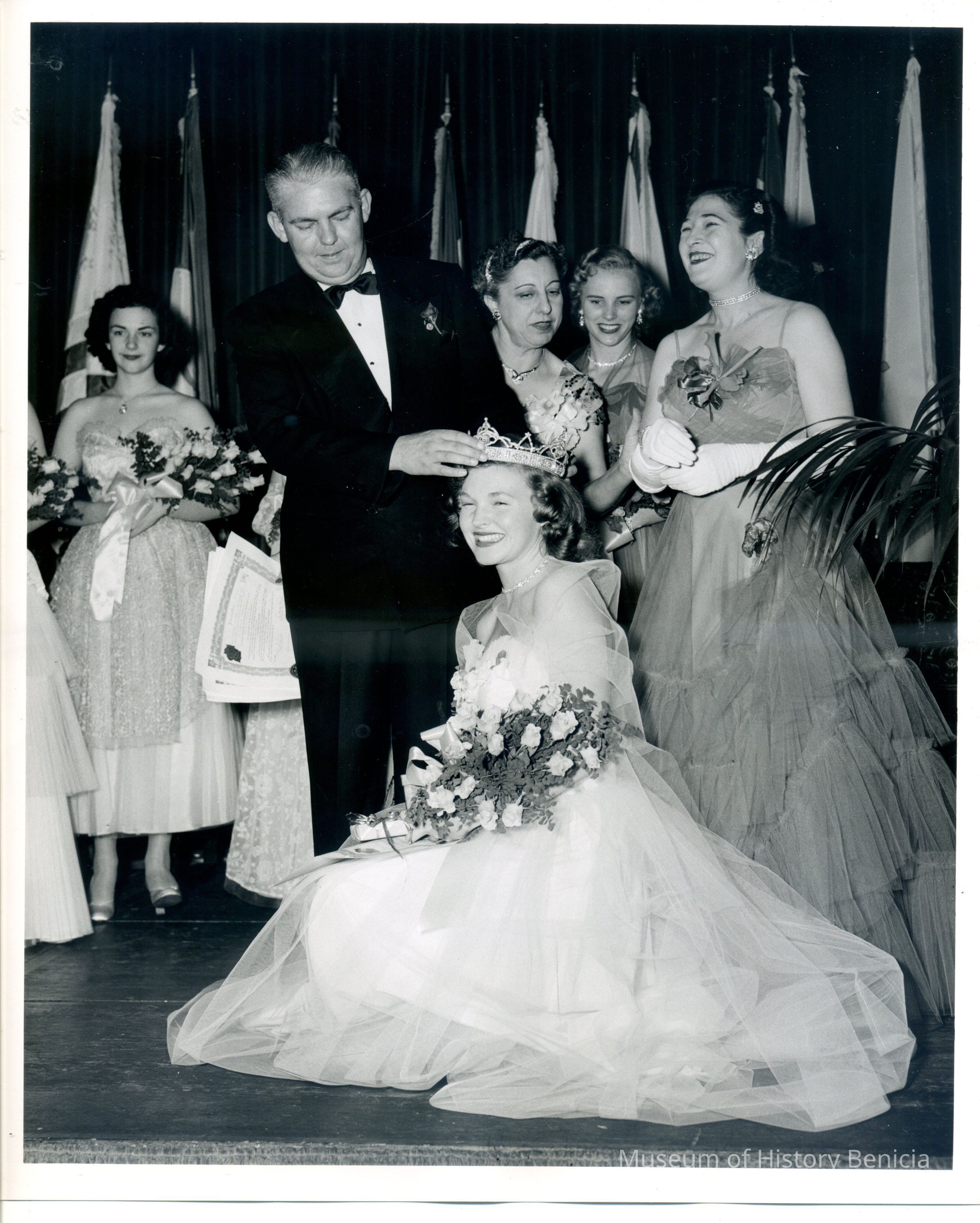 Photograph of J. Walter Kamb crowning Queen Mary Healey at the Girl of the West ceremony December 1, 1951. US Army Photograph