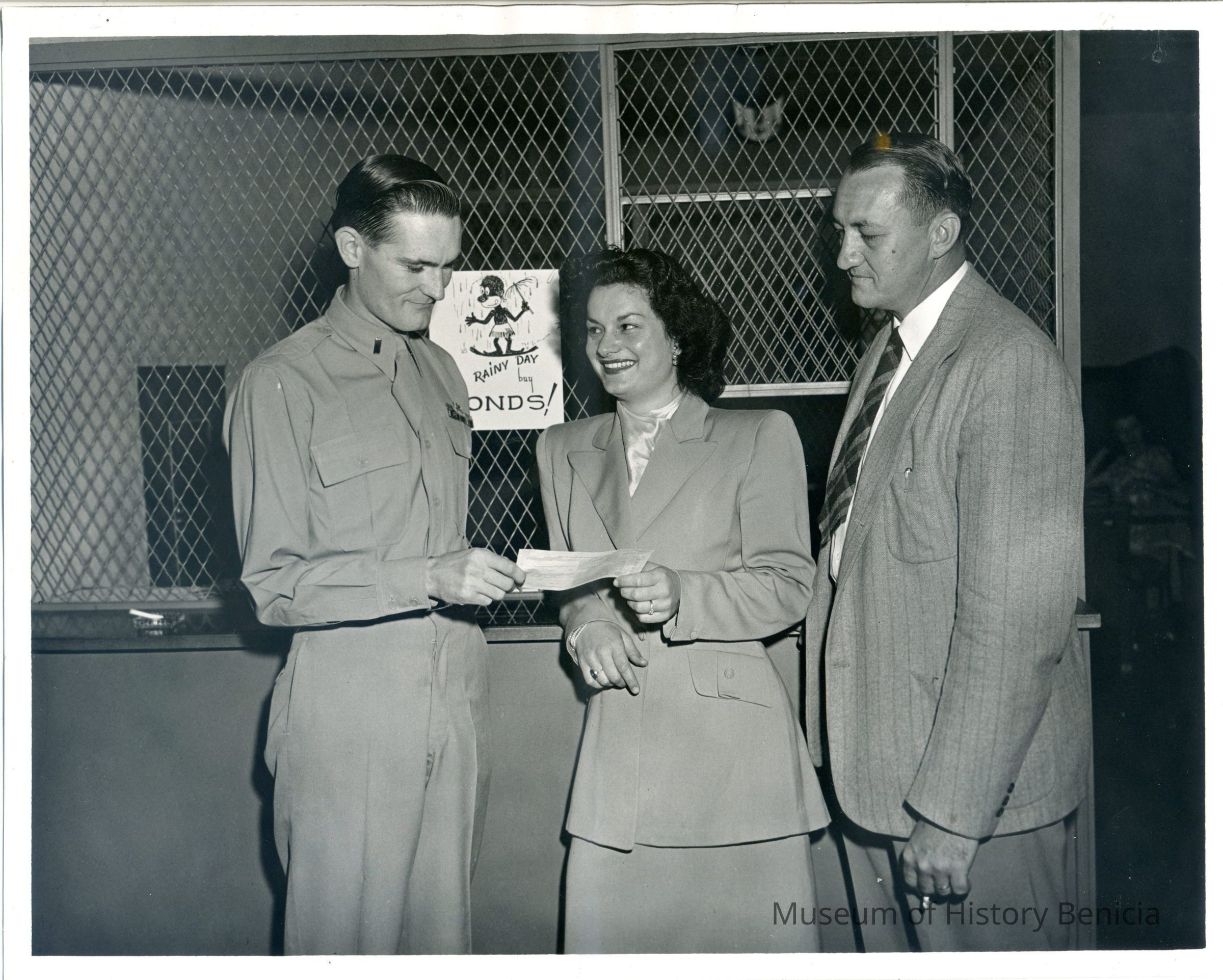 Photograph of Army cadet receiving Benicia Arsenal "Rainy Day Bonds". On Back: 19 May 1949, Dear Ruth, your pay master, Earl F. Underwood, 2nd Lt. To one of the best gals that I have met, Love Jaime.