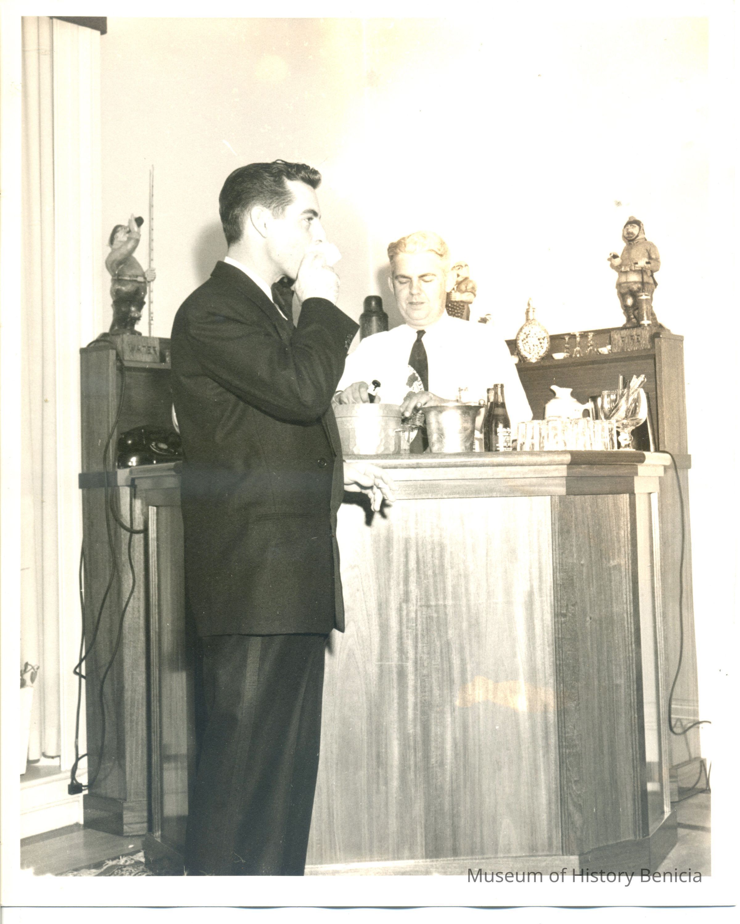 Photograph of J. Walter Kamb tending bar with unidentified man. c1957 US Army Photograph