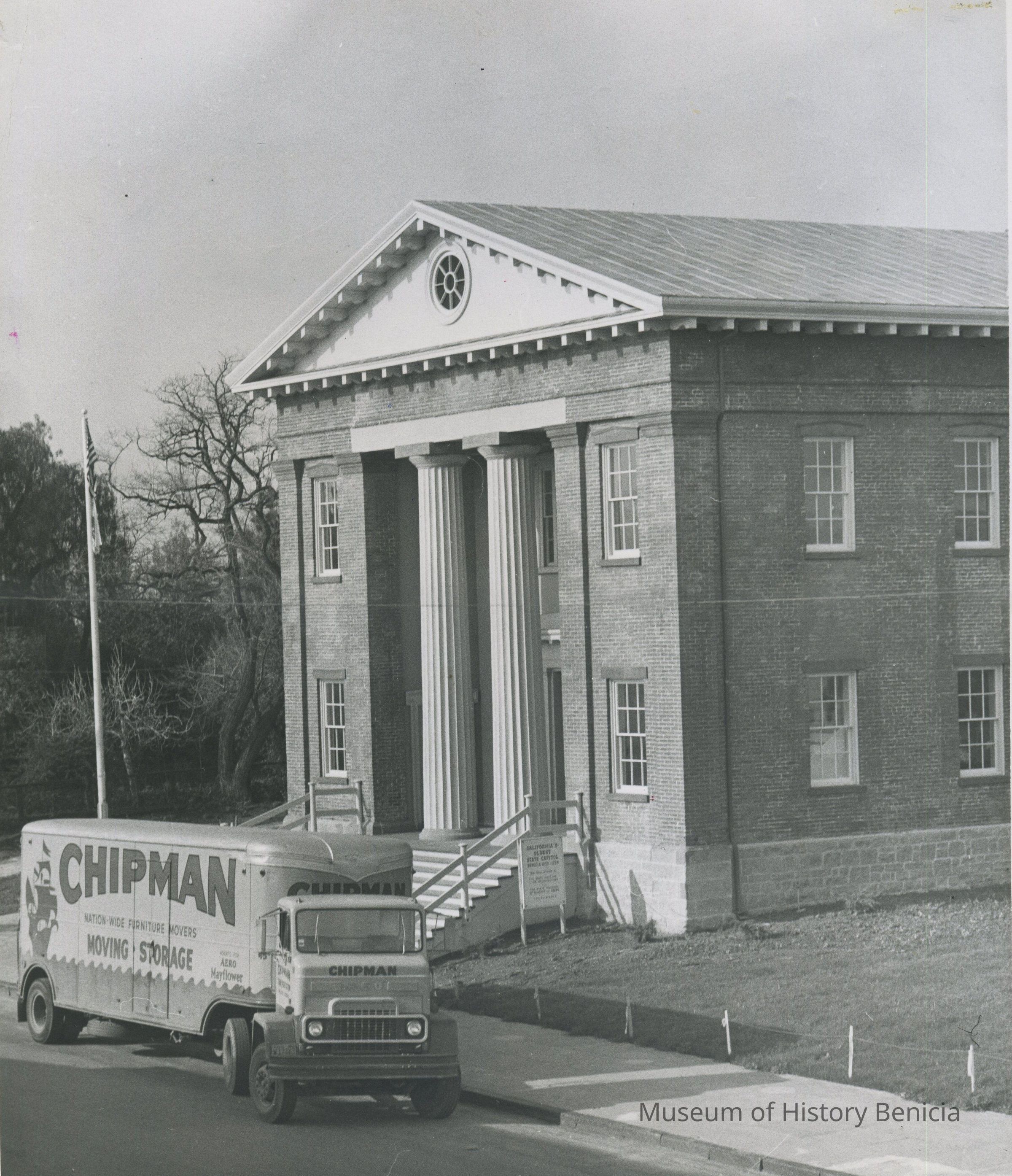 B/W Photograph 8" x 10" - Benicia State Capitol Building nearing completion of the restoration; the moving van is from a local company and was likely bringing in furniture to complete the inside restoration, 1957-58.Collection