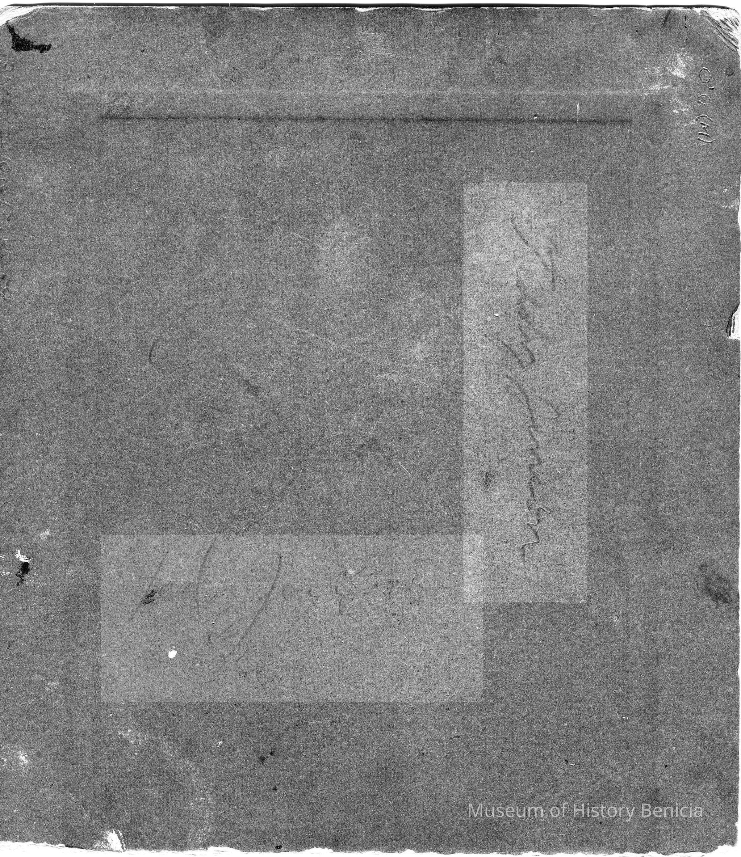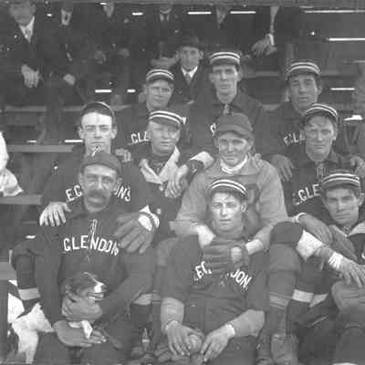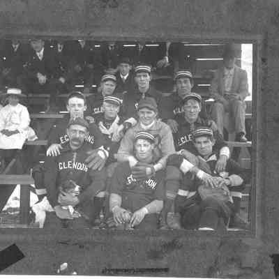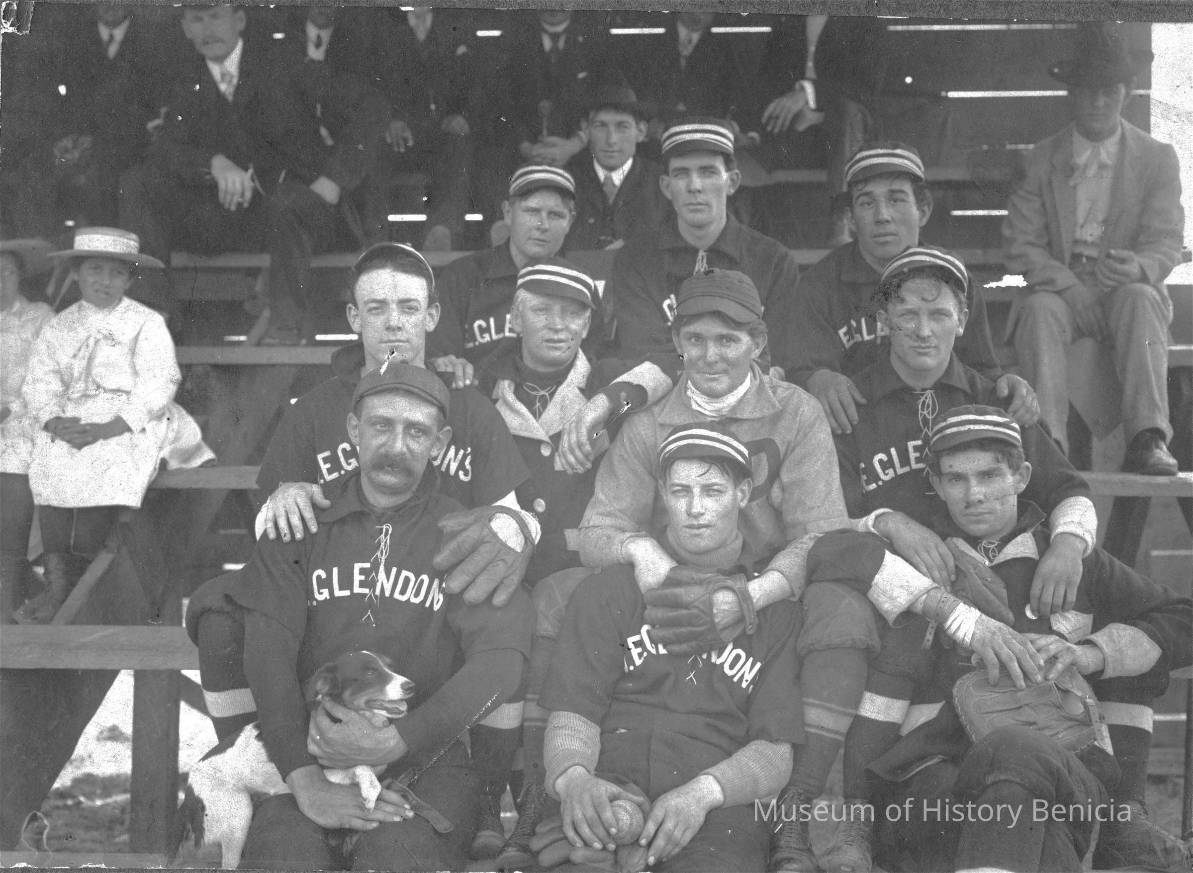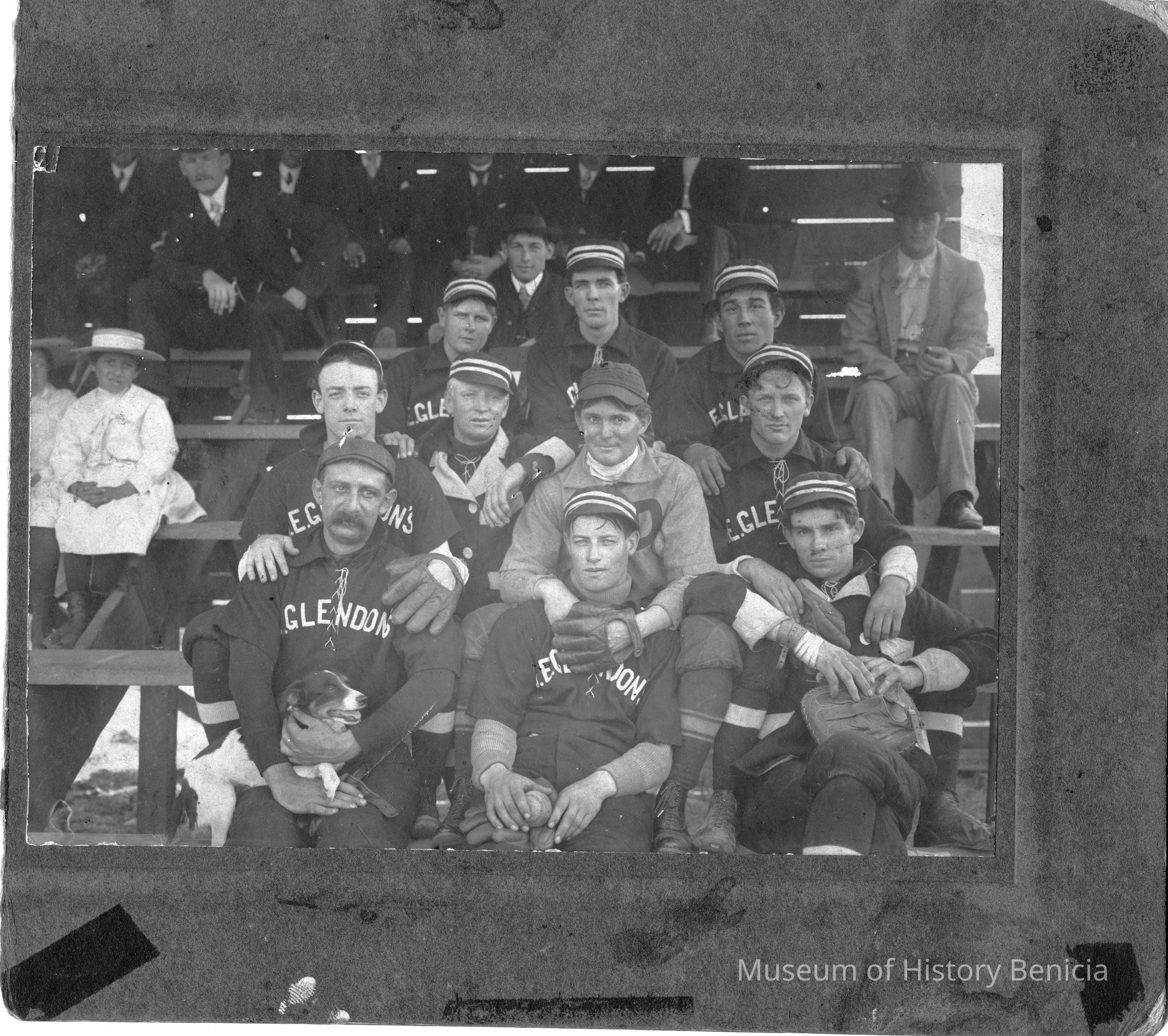 Photo of an old baseball team sitting in the bleachers. The team is the Glendon team from Benicia. The back has written on it "Ted Jensen", "Teddy Jensen" and a date of 1931. There is also a calculation adding 1890 to 21 for a result of 1911.Collection