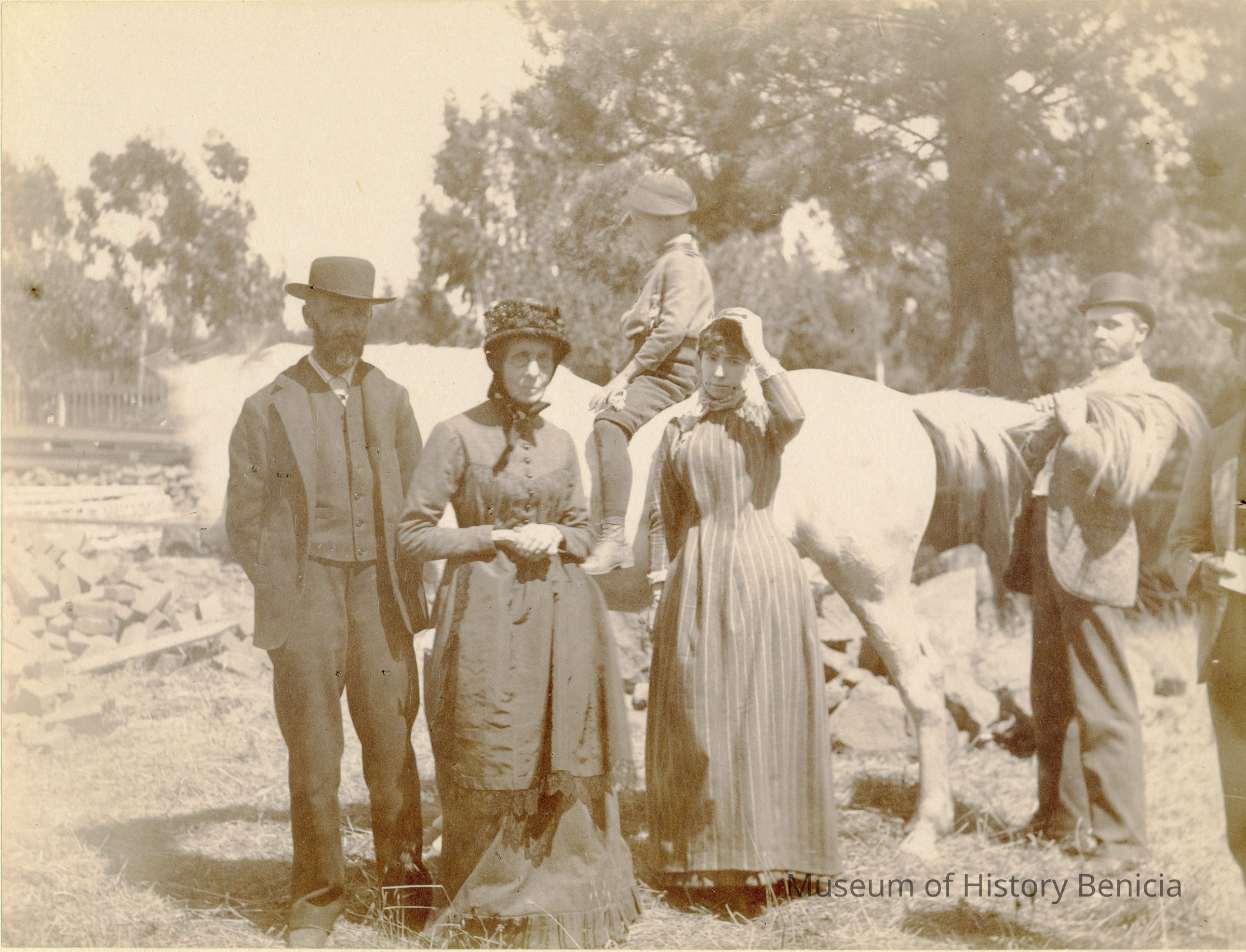 Photo of a family outside by a horse. These are some of the same people in 2012.011.0011. The two women and the boy are in both photos. On the back is written "Mrs Fish". The young woman looks like Henrietta Riddell-Fish.Collection