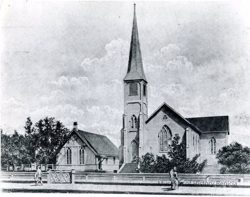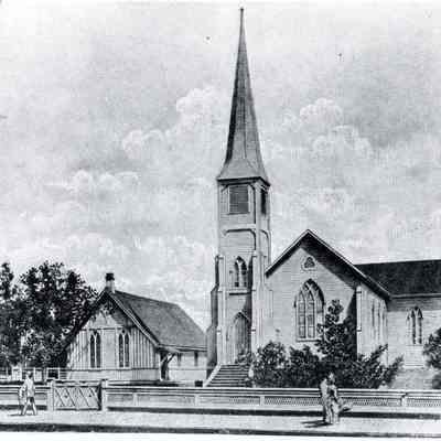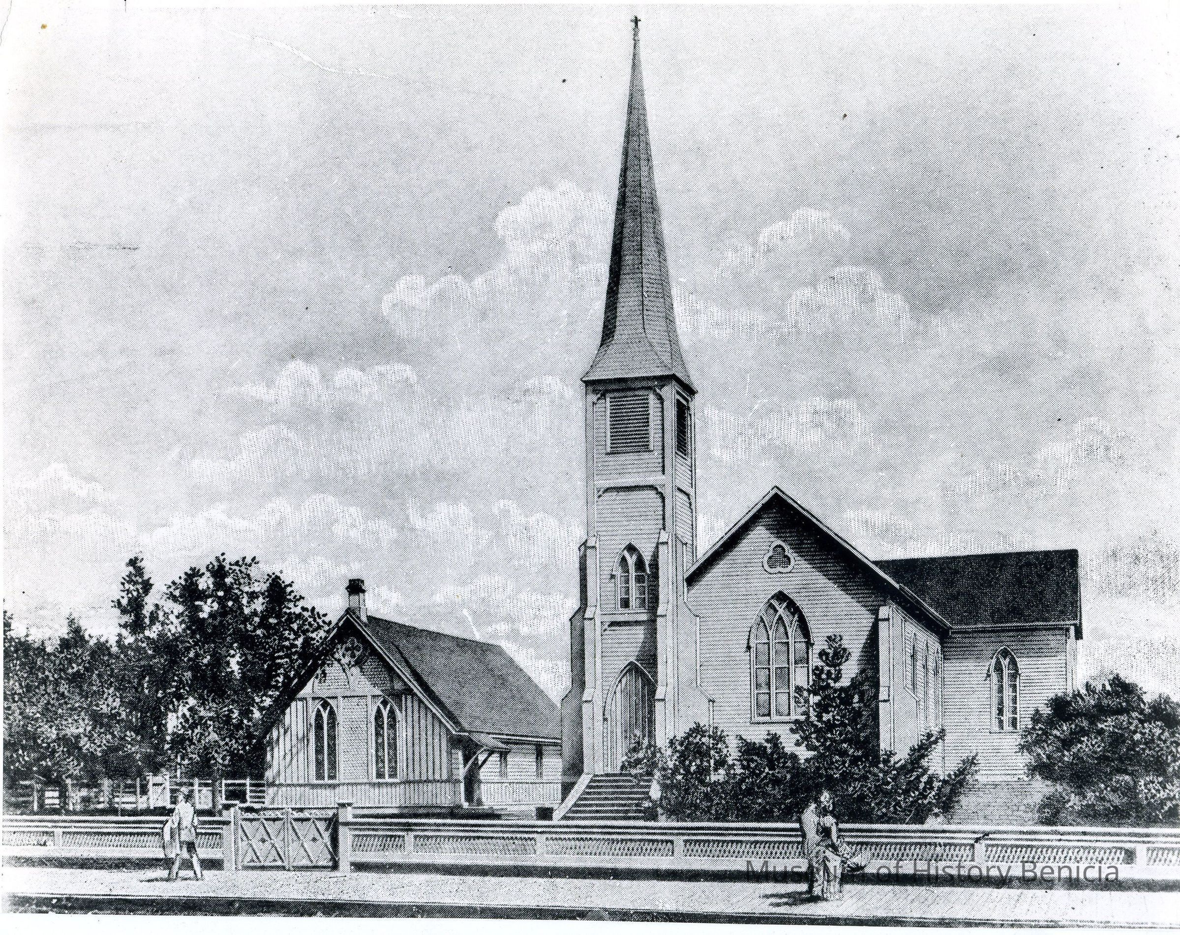 Photo of a drawing of the Episcoal Church corner of First and J st Benicia. This photo was probably used in the Charline Dillingham Erwin historical essay on St Paul's for the 125th anniversary in 1970.Collection