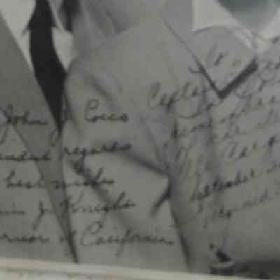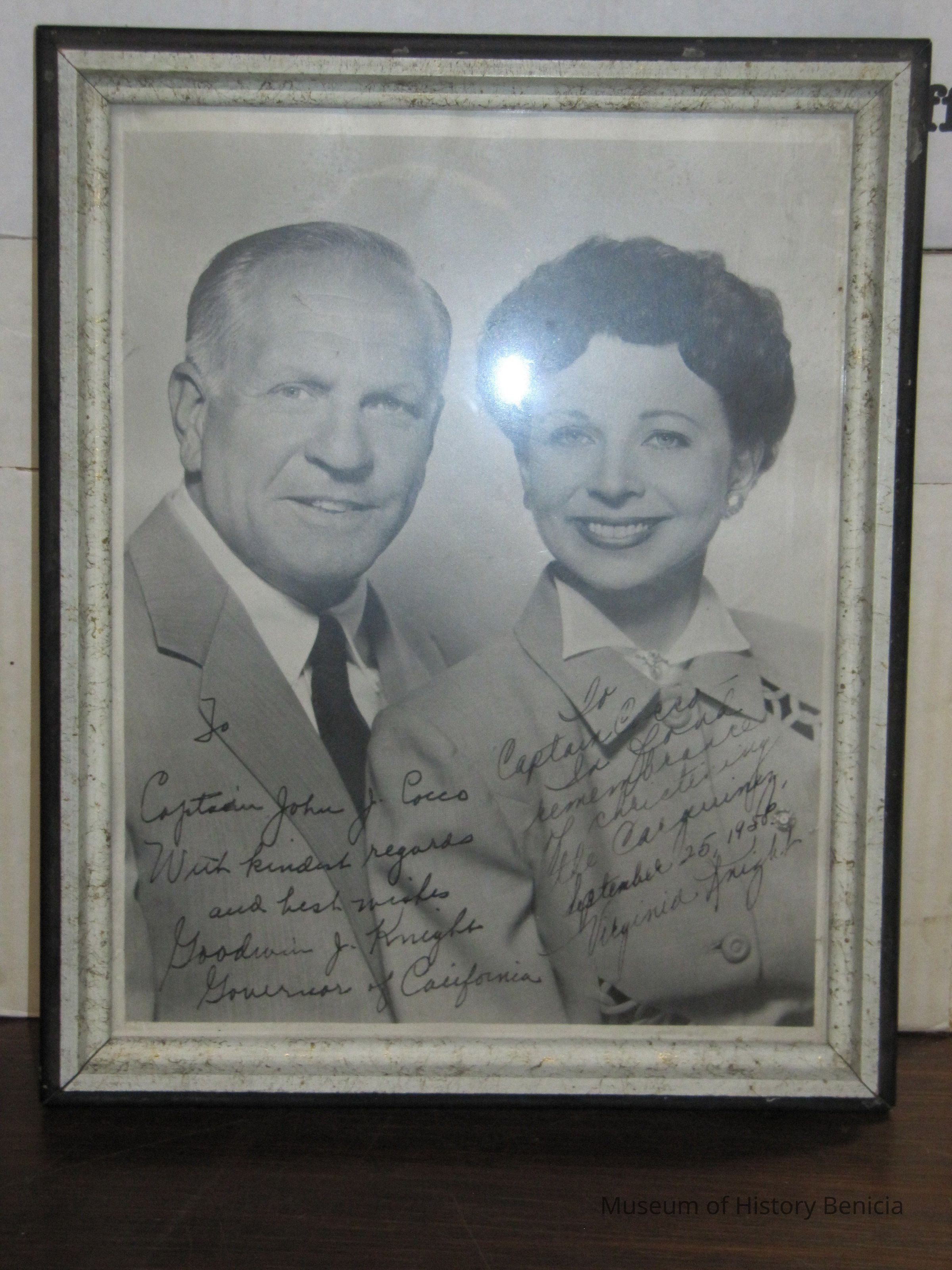 Black and white photo; bust length view of man and woman. Man at left has gray hair, light eyes, a light coat and a dark tie. Woman at right has dark hair and light eyes. "To Captain John J. Cocco With Kindest Regards and Best Wishes Goodwin J. Knight Governor of California" written below. "To Captain Cocco-- In fond remembrance of christening the Carquinez, September 25, 1958. Virginia Knight" written in ink below.Collection