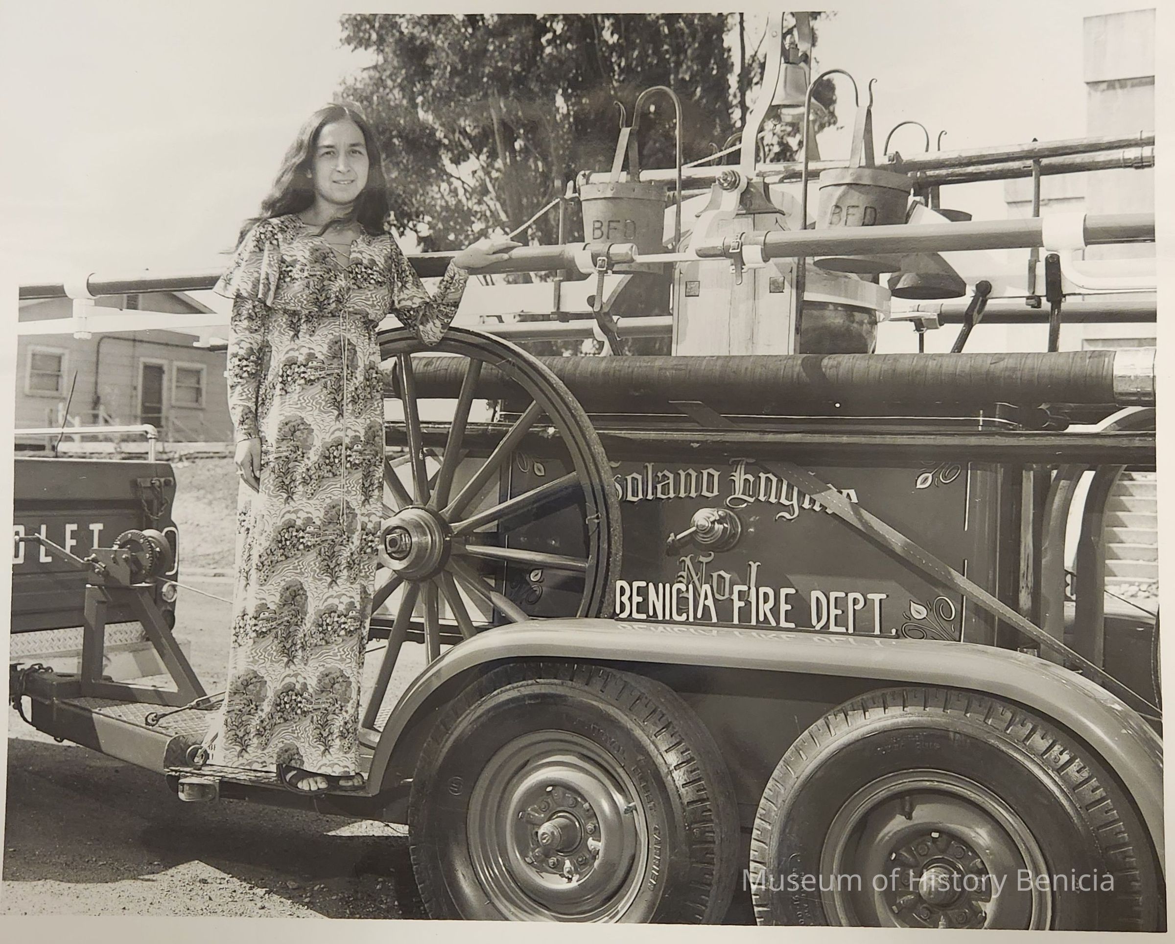 B/W photograph of a Firemen's Muster Queen contestant standing by Solano Engine No. 1.