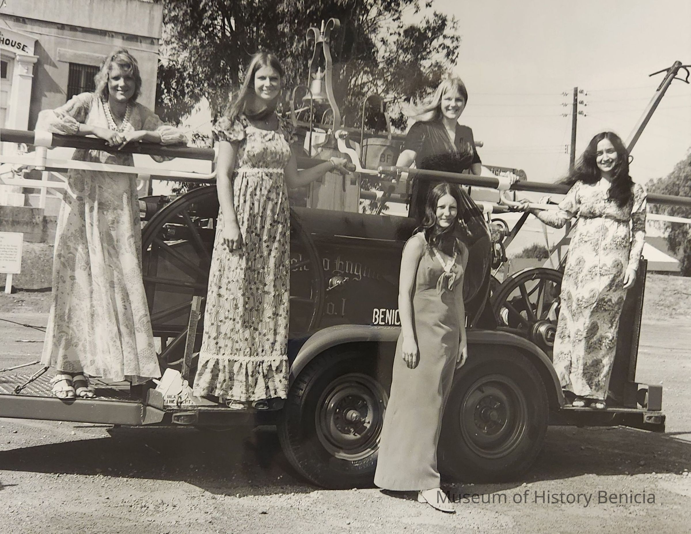 B/W Photograph of five young women involved in the Firemen's Muster Queen Contest. They are standing in front of Solano Engine No. 1.