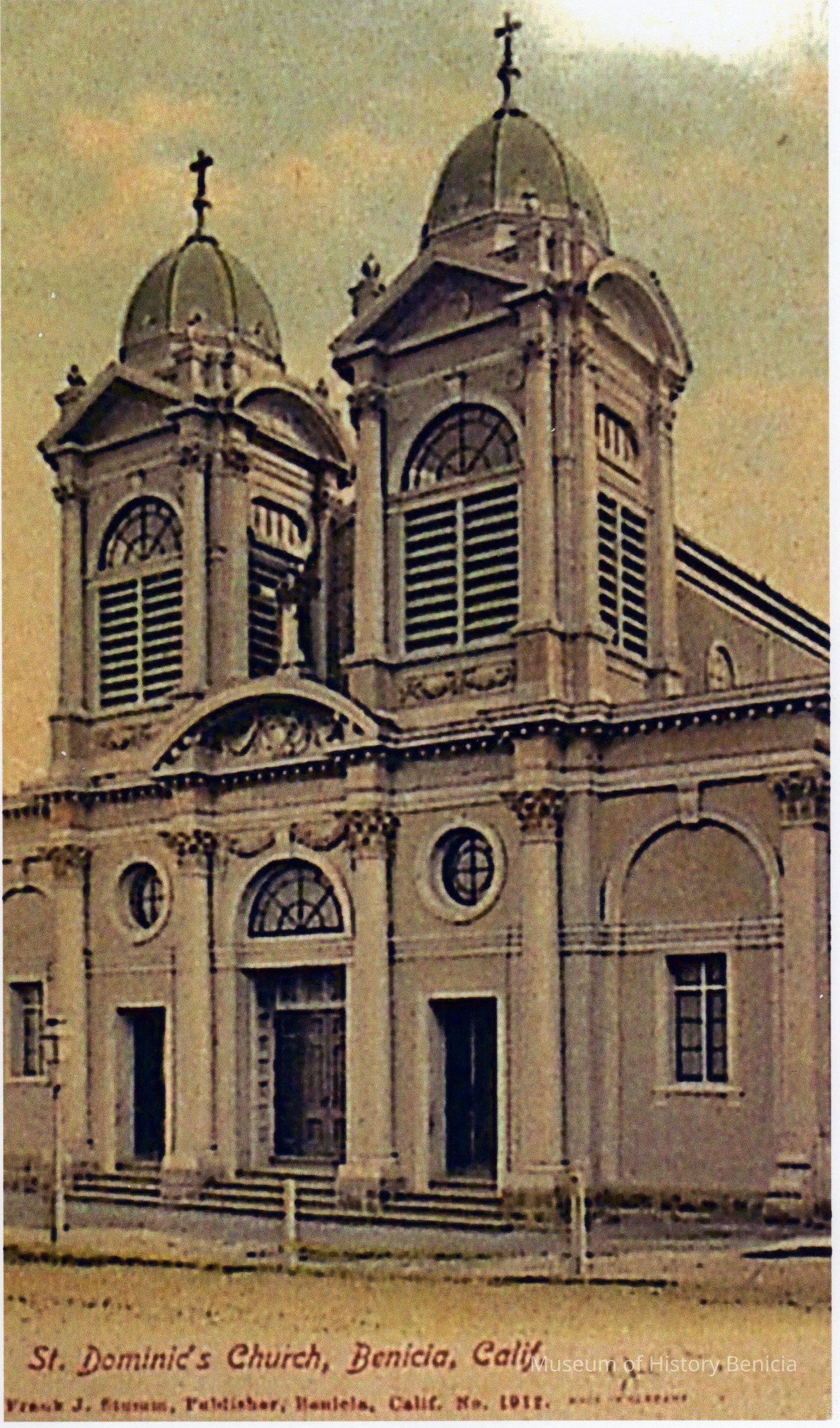 Color (slightly tinted) copy of Stumm postcard of front of "St. Dominic's Church, Benicia, Calif."