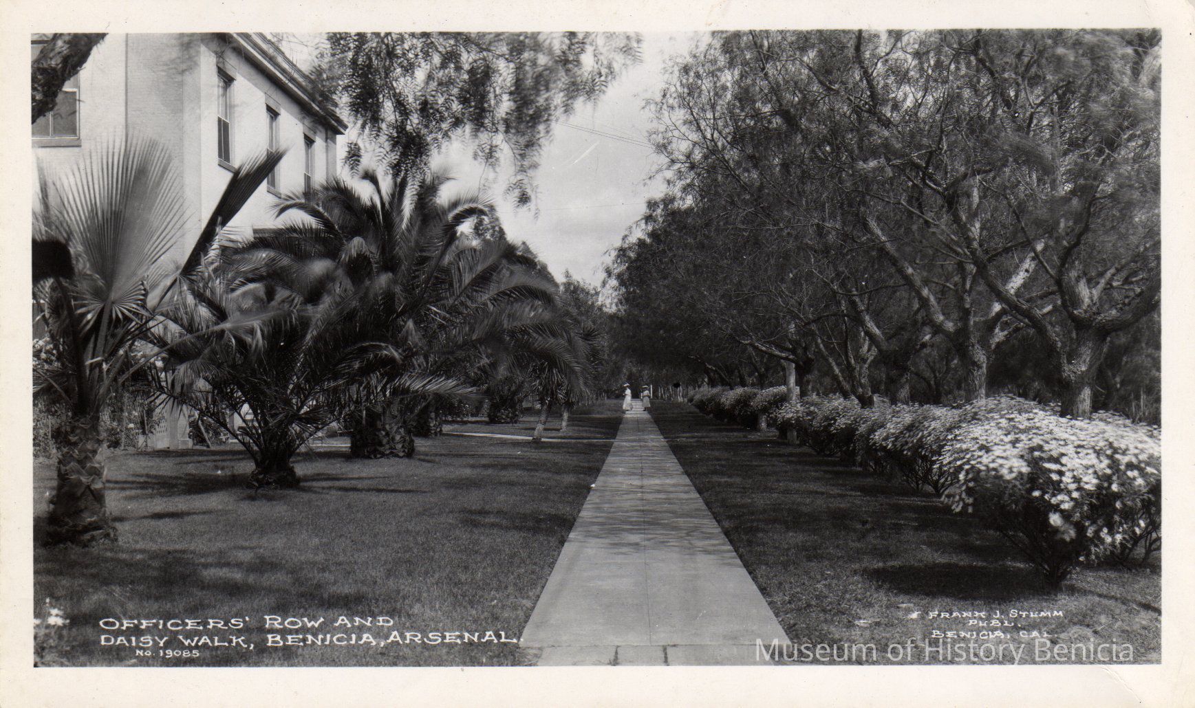 B/W photograph of Officers Row, Daisy Walk in the Benicia Arsenal. Published by Frank J. Stumm No. 19085