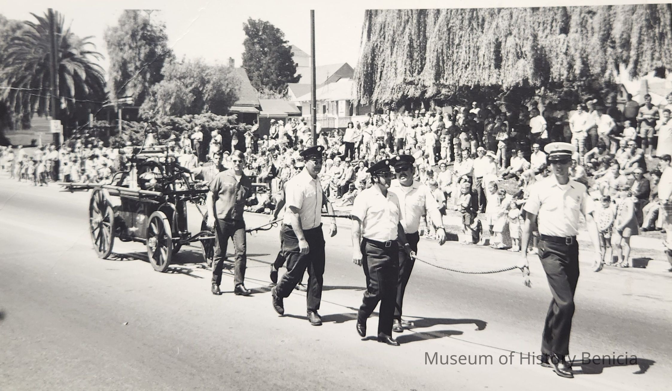 B/W Photograph of firemen from the Suisun Fire Department pulling a pumper passing by the Benicia City Park.