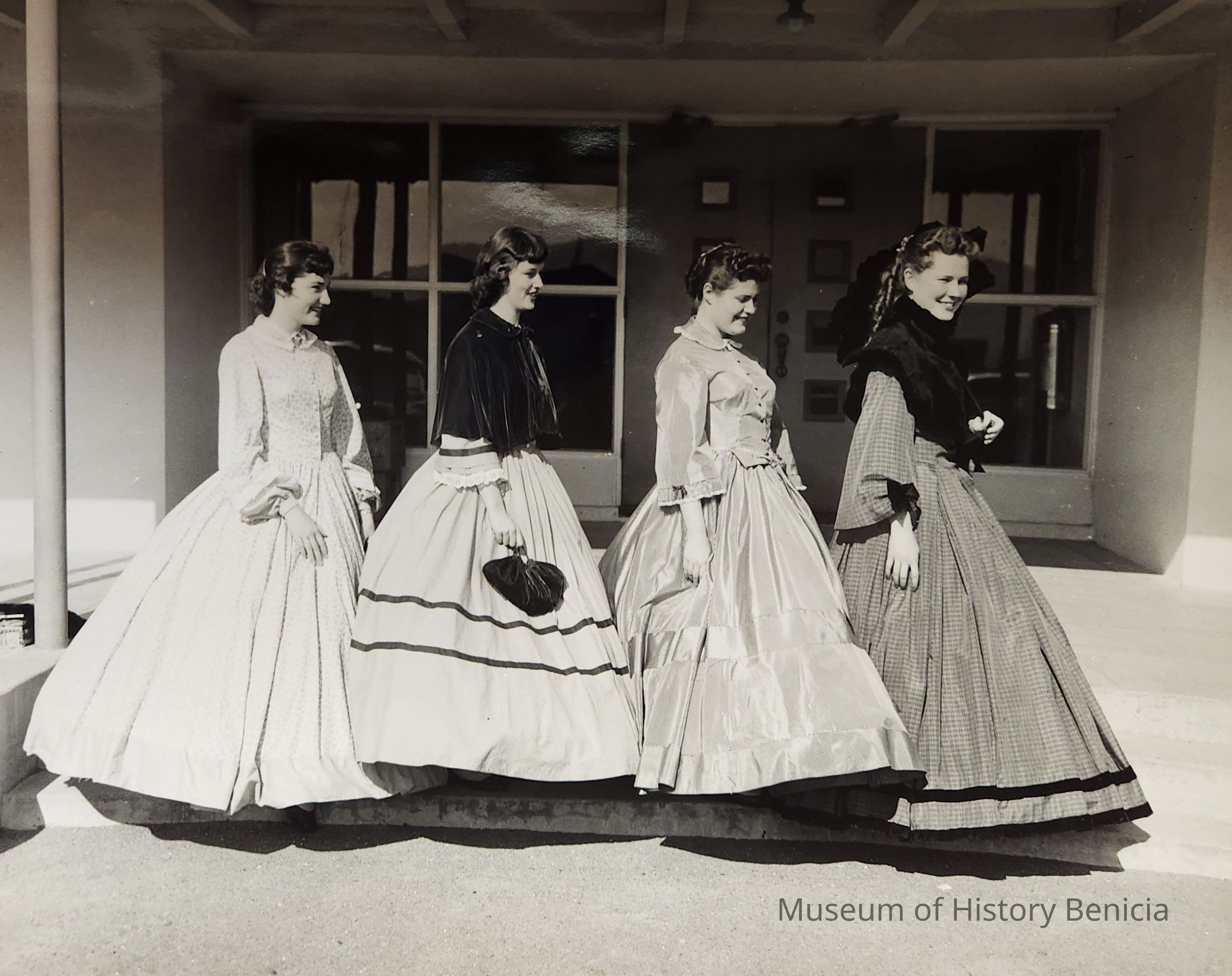 B/W Photograph of four young women in period dress. They are L-R: Sharon Harty, Mary Prudhome, Delma Pinkham and Karen Wold. It is about the time of the rededication of the Capitol building in 1958. They are standing near the door of the Benicia Veterans' Building.Collection