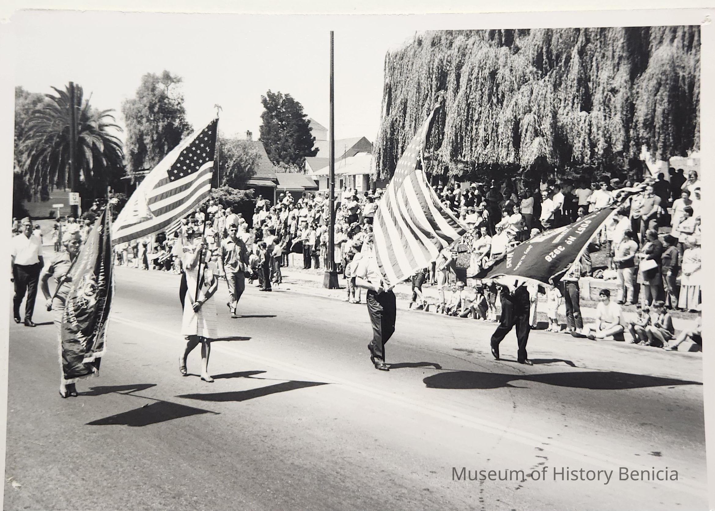 B/W Photograph of Flag carriers in a parade passing the Benicia City Park