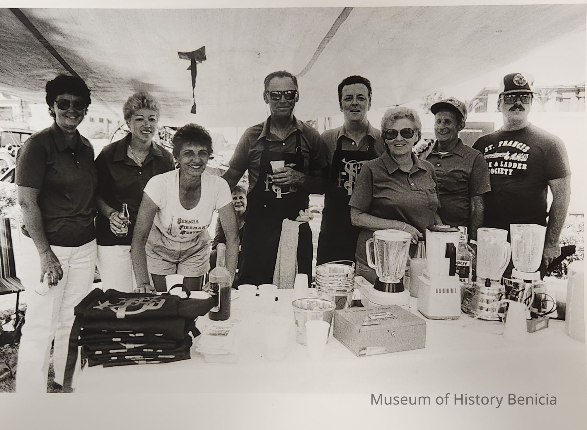 B/W Photograph of a group of people in a tented booth at a firemen's muster.