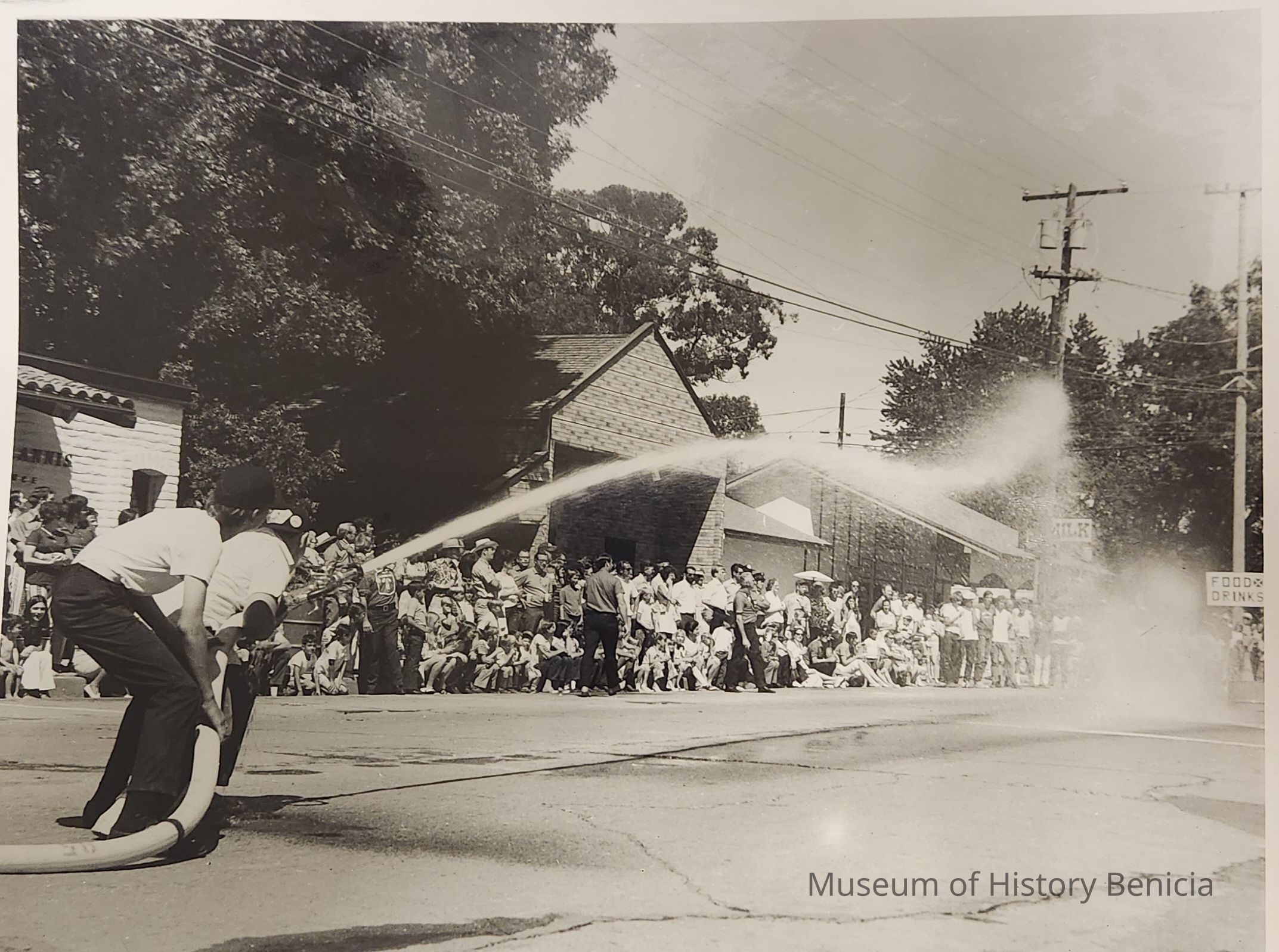 B/W Photograph of water distance contest at the Pleasanton Firemen's Muster in 1972.