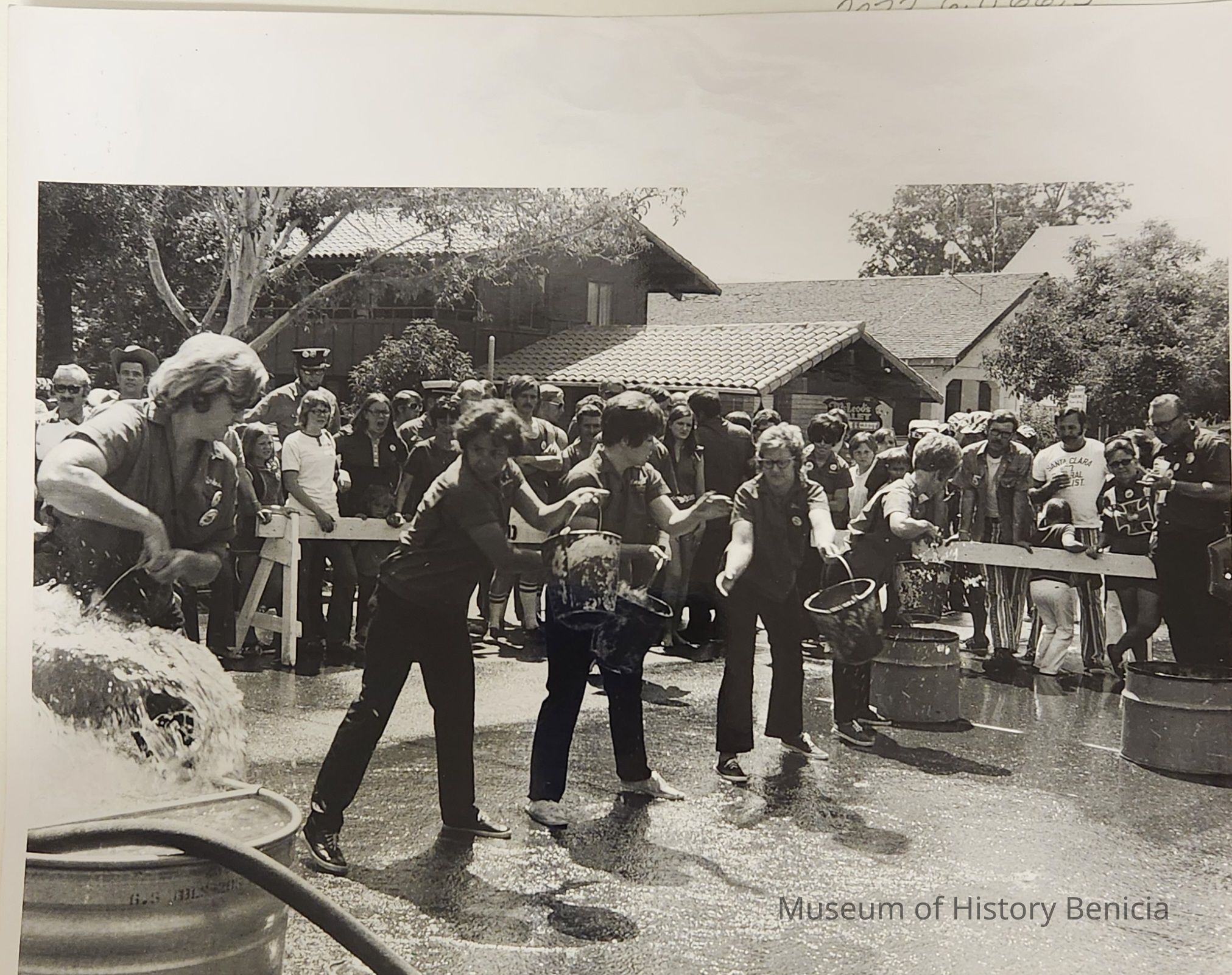 B/W Photograph of the Benicia Ladies' Bucket Brigade in action at the Pleasanton Muster in 1972.