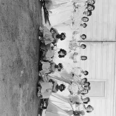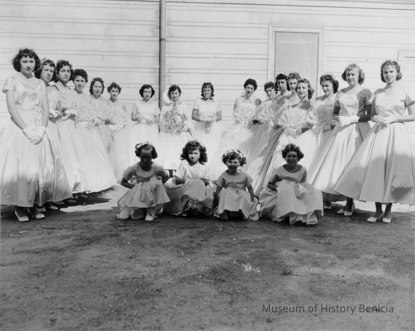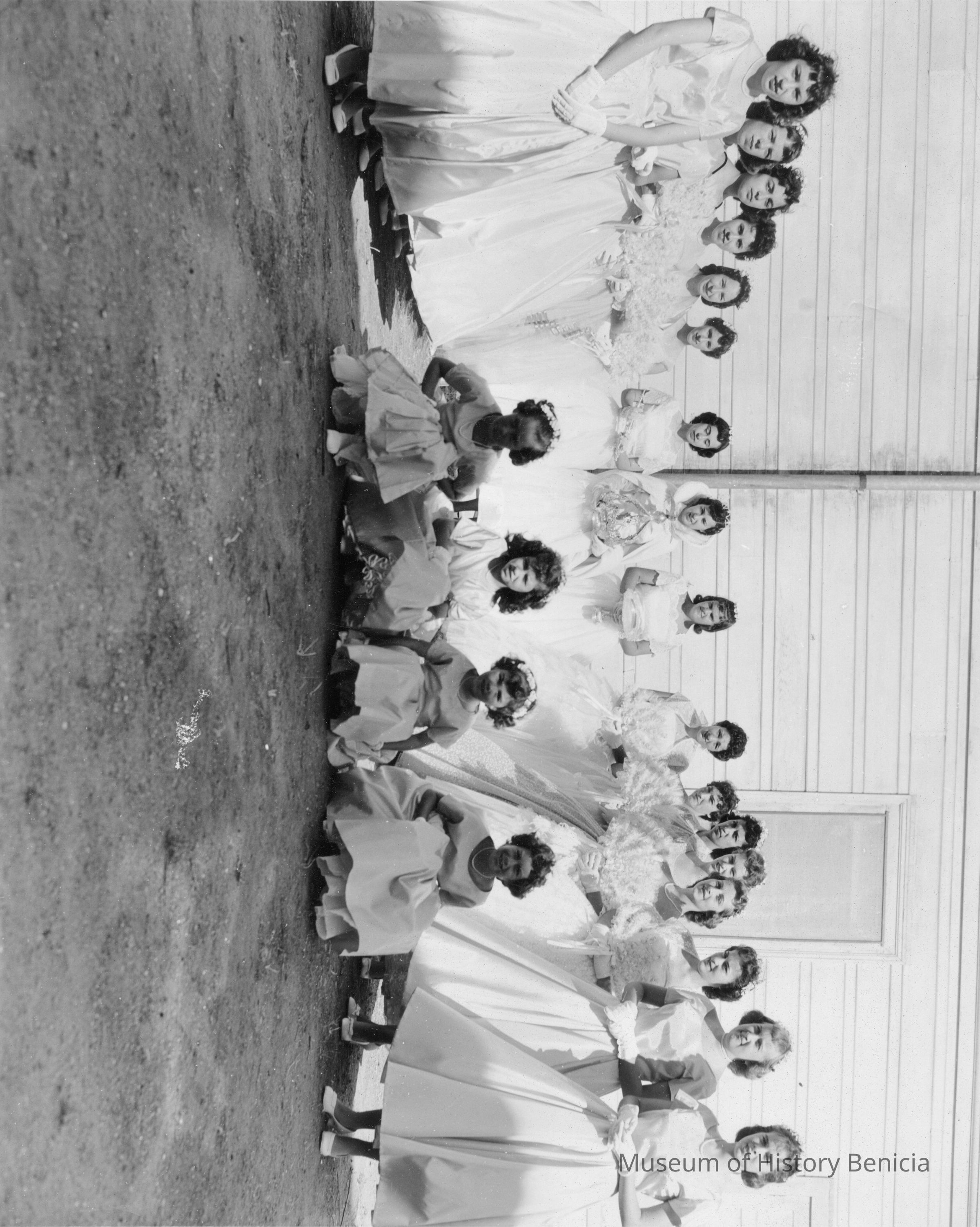 B&W photo of the Queen's Court from the Holy Ghost/Portuguese parade in 1958. Names, standing, L-R: Joan Bettencourt, Beverlee Lentz, Alice Santa Ana, Helen Santos, Sharon O'Connell, Stephanie Lopes, Arlene Mello, Queen Delores Bettencourt, Maryann Serpas, Arlinda Galvin, Sharon Harty, Frances Bettencourt, ?, Kay Core, Judy Core, Lois Ann Sheetz, Patricia O'Grady. Of the four young girls in the front, only the third from the left is identified. She is a cousin of the Queen, Gloria Leno.Photograph Details