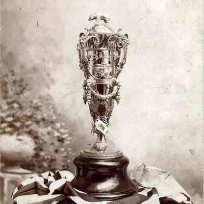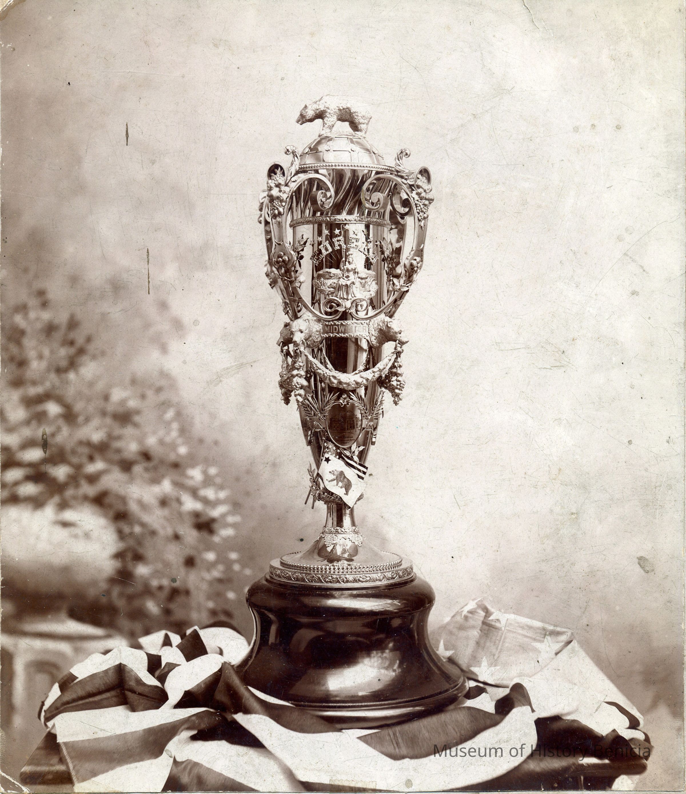 B/w photograph of a trophy sitting on an American flag. The trophy has Eureka midwinter etched into it. The Lenoir Miller Collection.