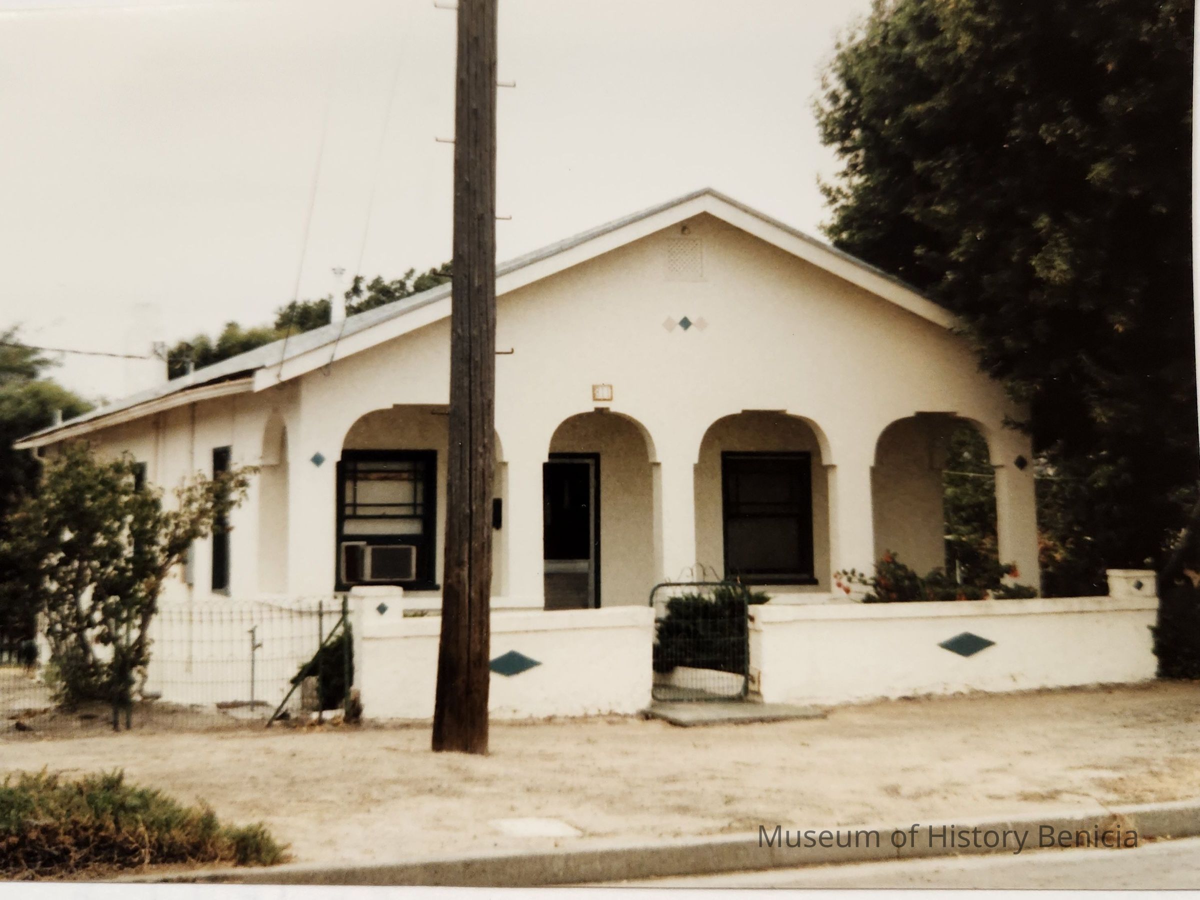 This 1933 stucco bungalow with basement incorporates a very early Benicia dwelling. The gable roof extending over the entire front creating a narrow porch which has four decorative arches. On either side of the centered main entrance are identical wooden double hung sash windows with small panes outlining the upper sash. The interior of this nearly square house is all original lath and plaster with the exception of the kitchen entry which has some sheet rock. The 1930's had handsome light fixtures and remain. The exterior low stucco over cement fence across the front is intact with a diamond shape decoration repeating the small ceramic tile motif at the gable and at the corners of the porch.