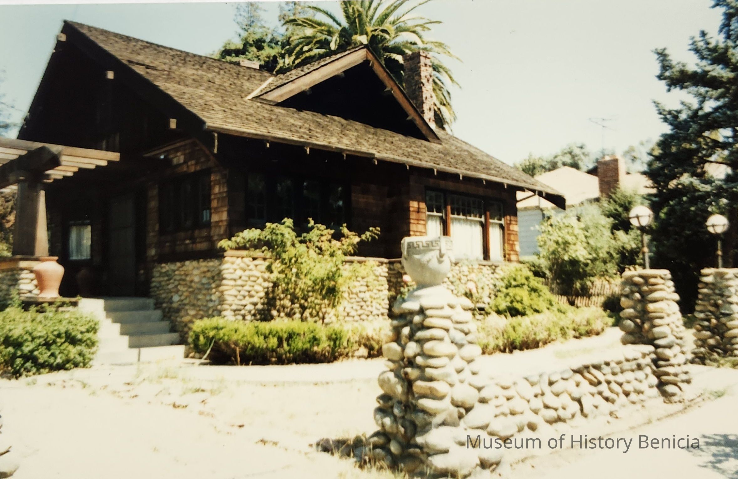 This residence is a 1-1/2 story Craftsman Bungalow. The structure is "T" shaped formed from two intersecting gables. The roofline shows both exposed rafters and beams. The wood frame, wood shingled unit sits on a raised basement faced with large river stones. A two-windowed dormer extends on either side of the intersecting section. The rustic home is faced with multipaned rectangular windows. A small porch extends off the front door (located on the western end of the intersected gables) and is covered by open beams. The porch roof is supported by elephantine columns. A small bay with windows confines the porch to the south. A low segmented wall of large river stones frames the home to the street.Collection