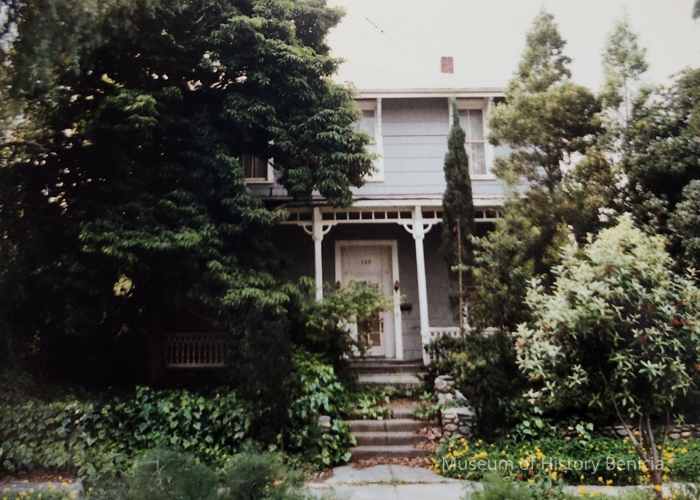 The "Coates House" is named on the 1886, 1891, and 1899 Insurance Maps and quite possibly was built as a rooming house rather than as a residence. In any case, along with the Ripson House next door this was the residence of school teachers and single professional people. F. Cummings owned bhe property in 1880 and at that time the grounds included two city lots, or 300' by 250'. This appears to be the only unremodeded or moved rooming house remaining from 19th Century Benicia and its architectural integrity, except for the asbestos siding, is intact. J.B.Johnson, City Marshall in 1904, owned the property in 1919, but he did not live there.Collection