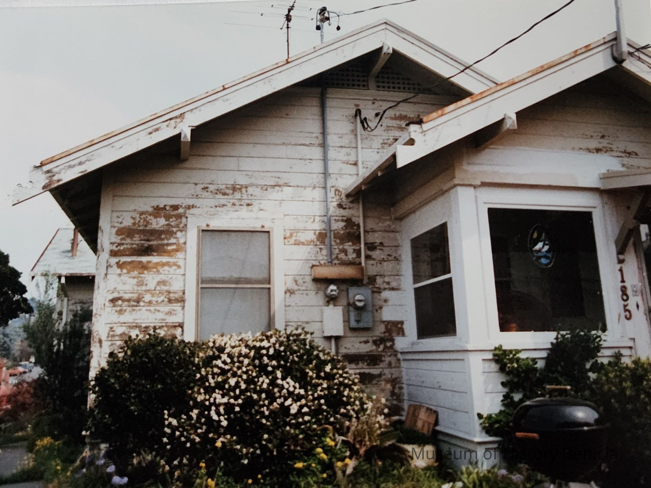 This very plainwood frame one story California bungalow has double gables with wide eave overhang and decorative end cuts on the end boards which are supported by wooden brackets. The building is clad in smaooth flush boards. The off-set gable roofed front porch as been enclosed. This house is obscured by a modern two story residence.Collection