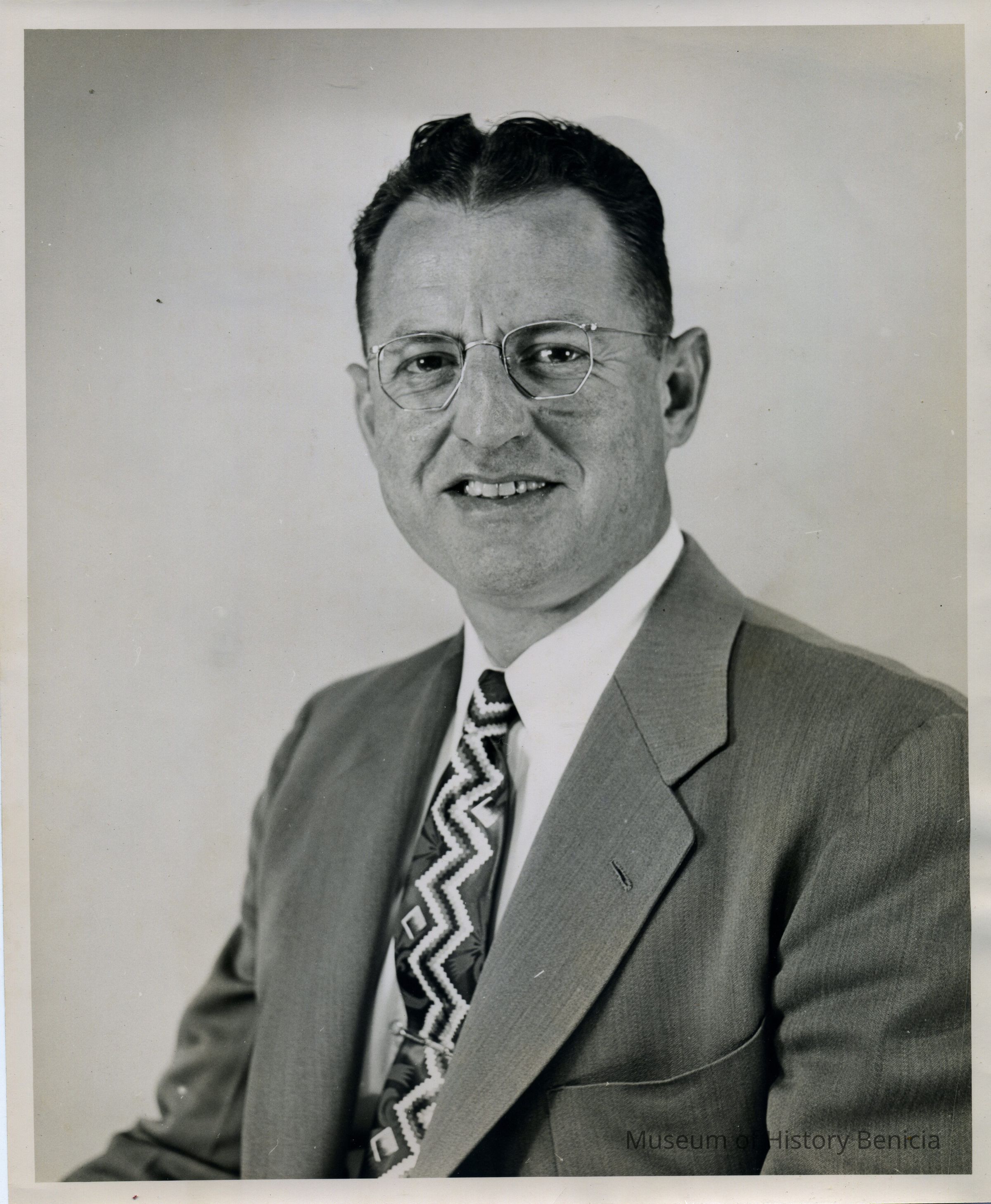 Portrait of Edward Koenig, mayor of Benicia from 1956 to 1958. Black and white photo.