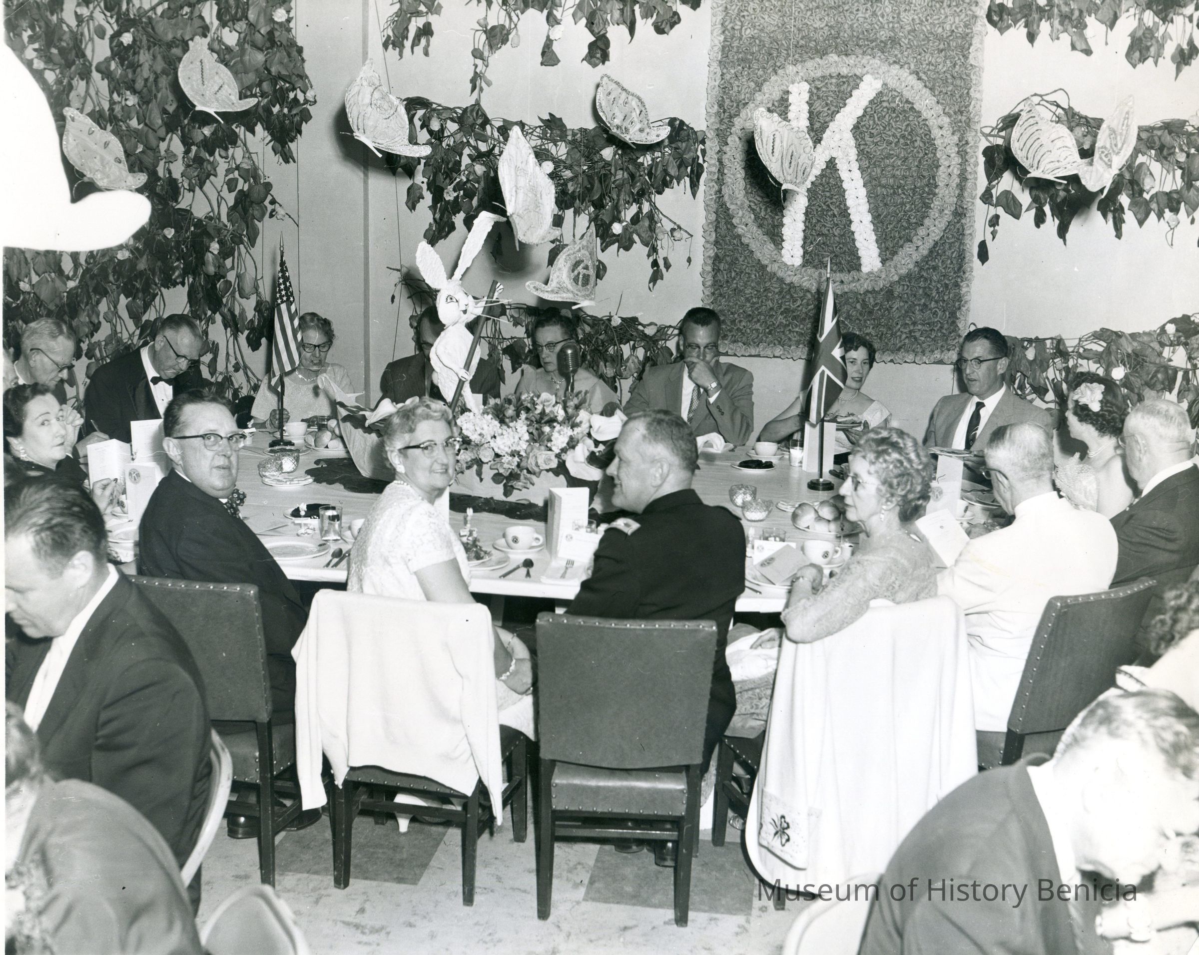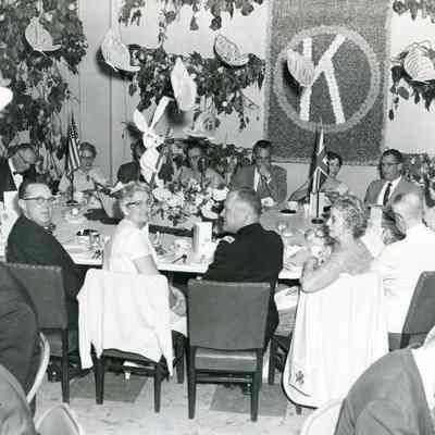 Black and white photo of Kiwanis Club party. Ed Koenig is seated to the right of the British flag.
