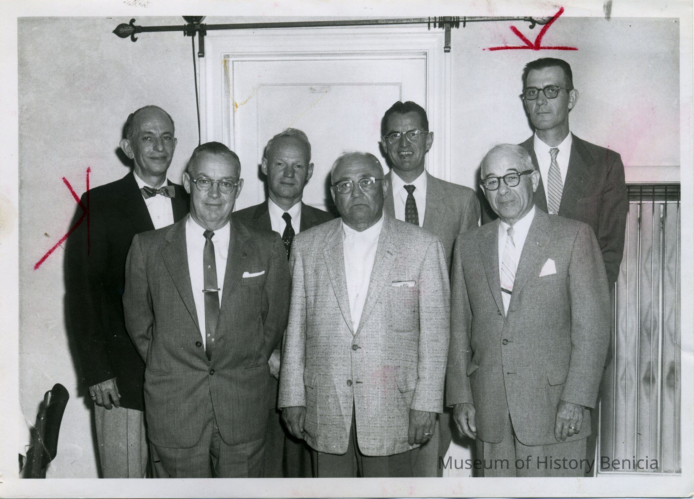 7 men stand in a room by a door w/ a curtain rod over it. Ed Koenig 3rd from rt. B/W
