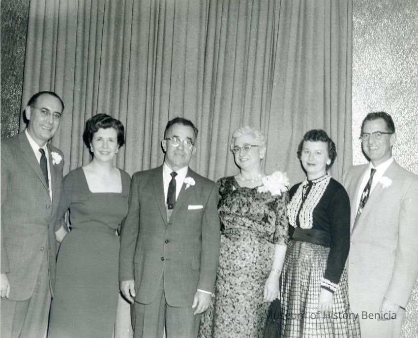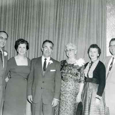 3 couples stand by a curtain in suits and nice dresses. Couple at rt are the Koenigs. B/W. Couple at left are Mr. & Mrs. John Power.Collection