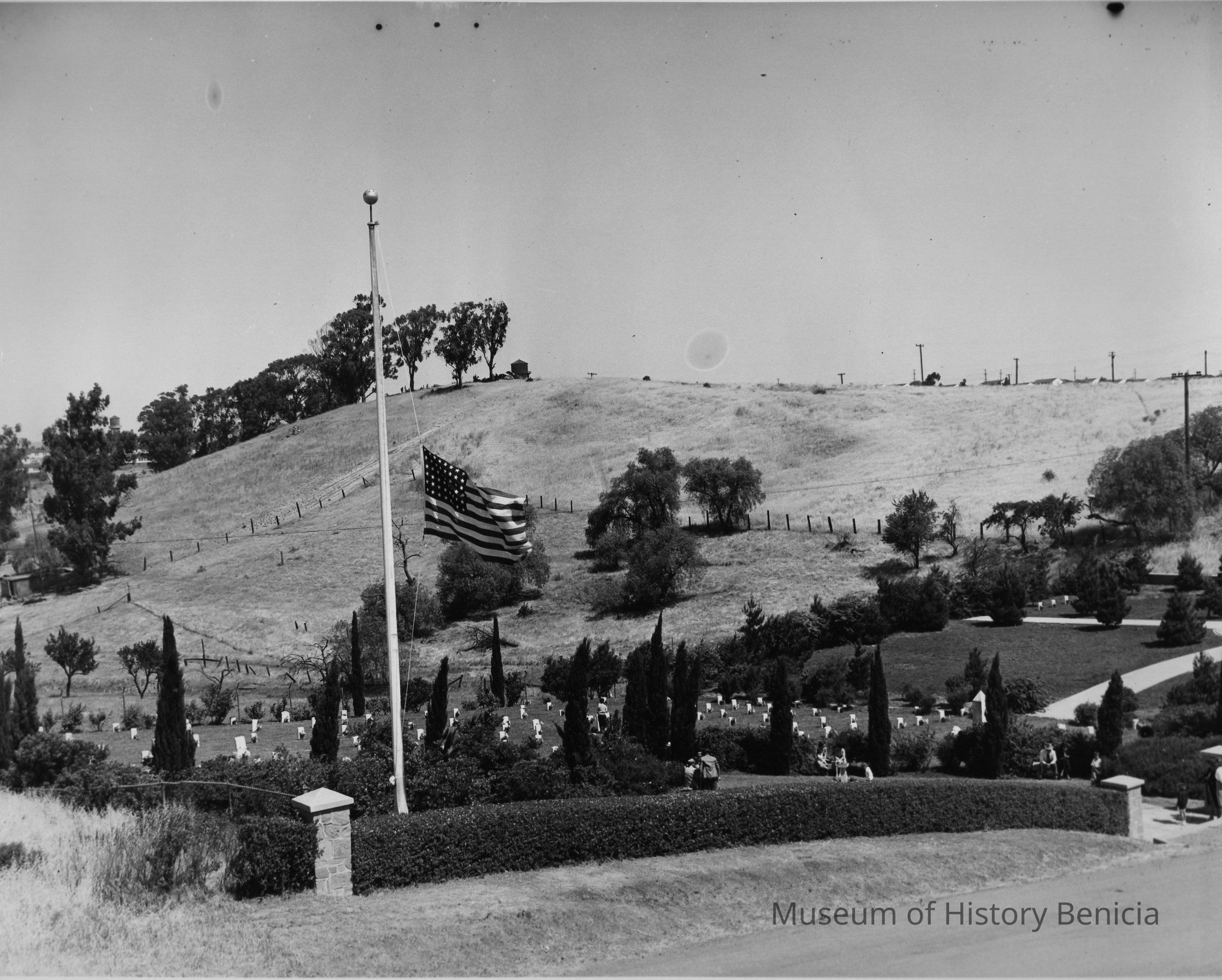 B/W photograph: a few people wander in the Arsenal Military Cemetary. US flag at half mast.