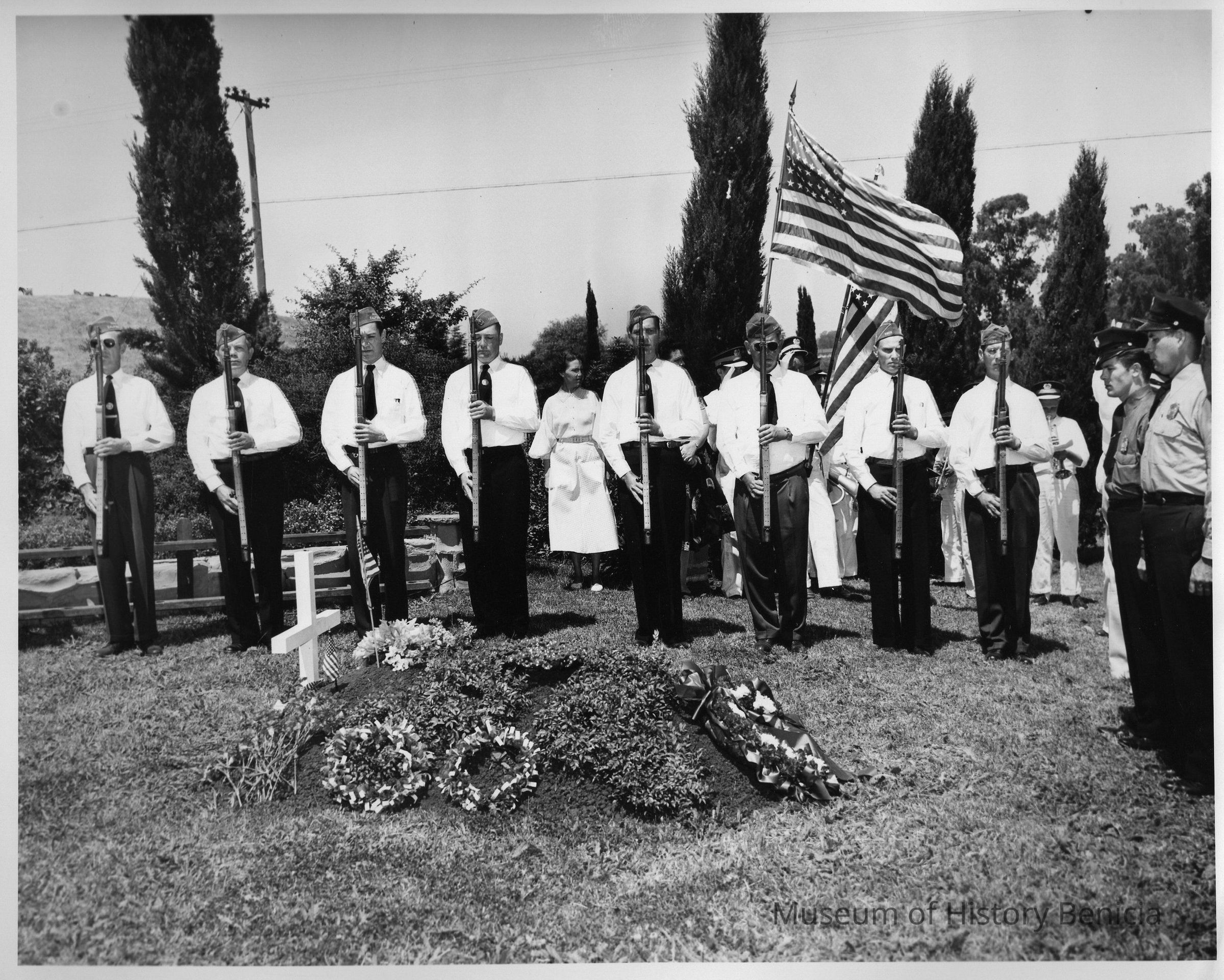 B/W photograph: 8 men w/ guns, 2 others stand at attention by grave w/ wreathes on it. Unmarked cross at grave head. Band and others stand behind.Collection