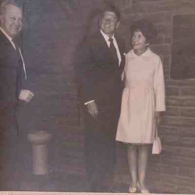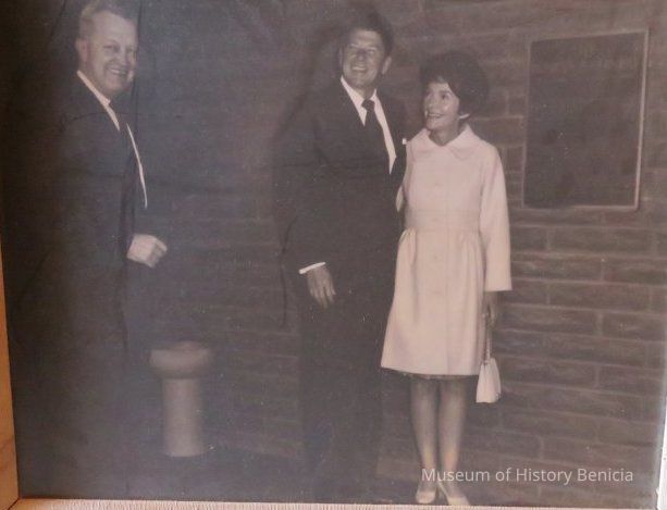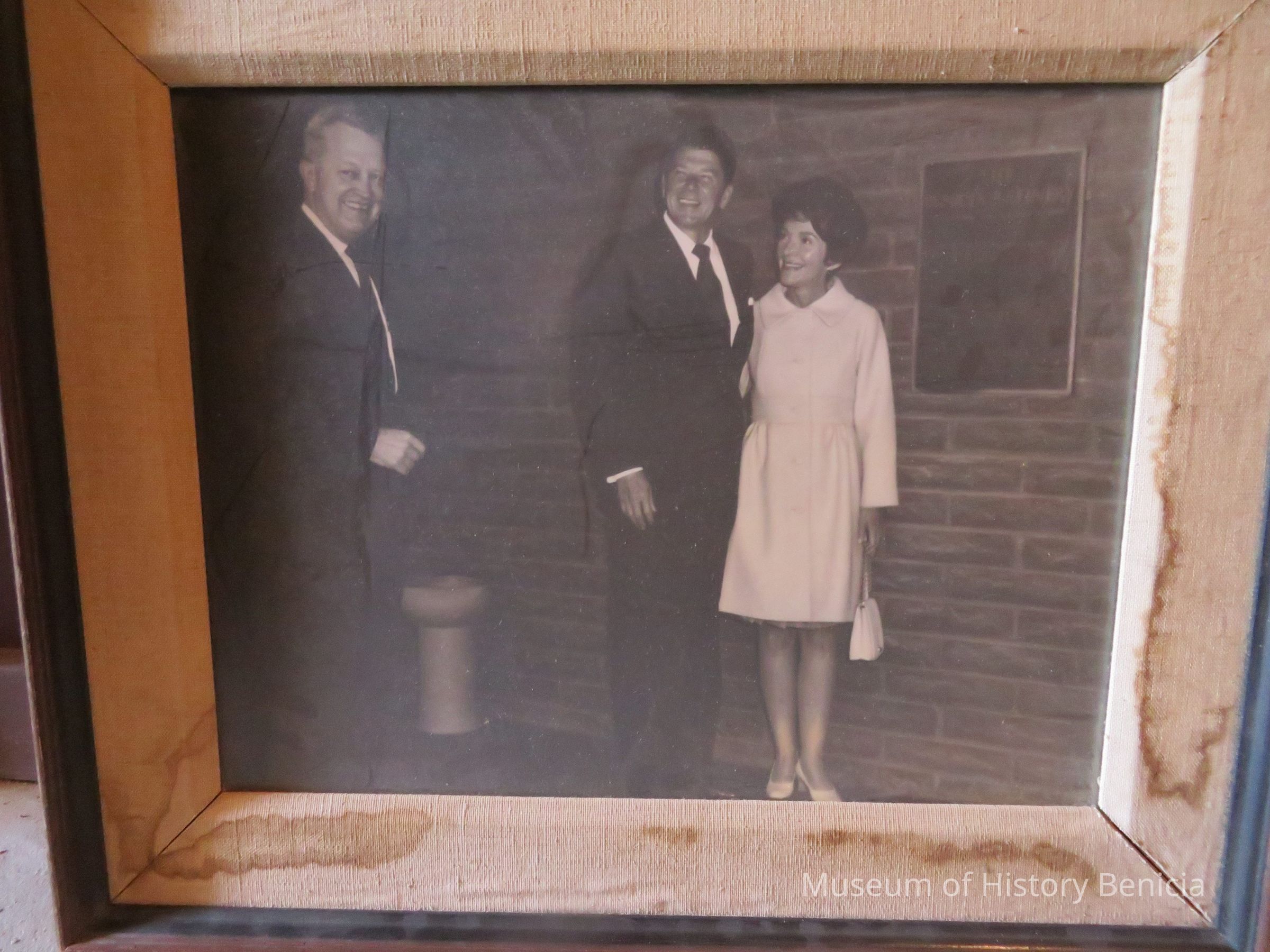 B/W photograph of Ronald Reagan and wife Nancy Reagan standing with unidentified gentleman next to a bronze plaque that reads "The Benicia Refinery".Collection
