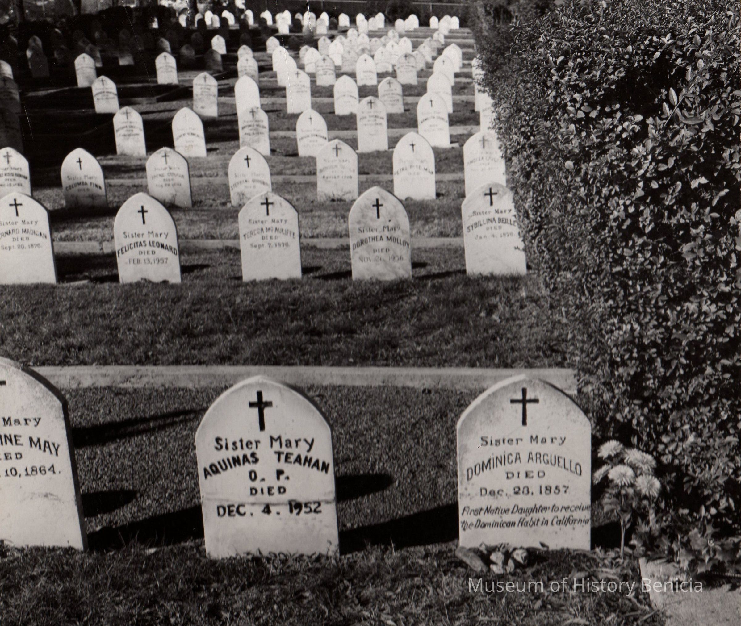 B/W Photograph: Gravestone of Sister Mary Dominica Arguello in the Benicia St. Dominic's Cemetery. Inscription on gravestone reads: "Died Dec. 23, 1857 / First native daughter to receive the Dominican Habit in California."Collection