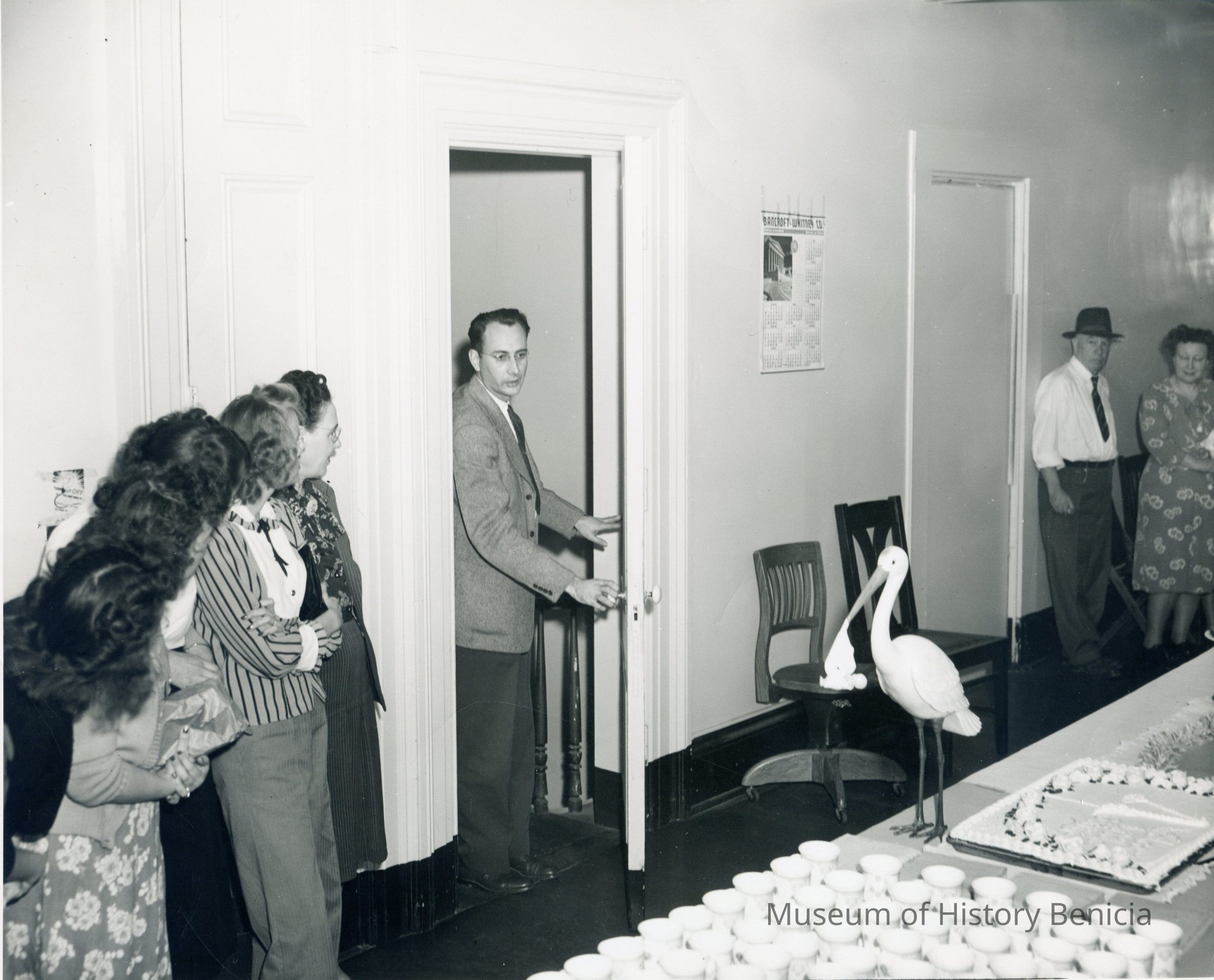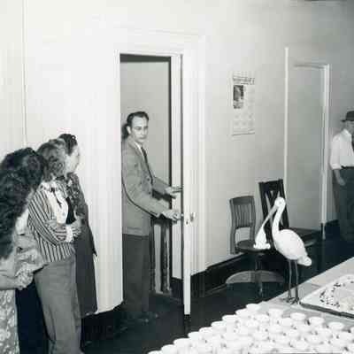 Black and white view of man (Mr. John Power) opening door to room with women and party goods, including a stork statue, on a table. The occasion is a baby shower for Mrs. Ann Marchioni, in either 1944 or 1949.Collection