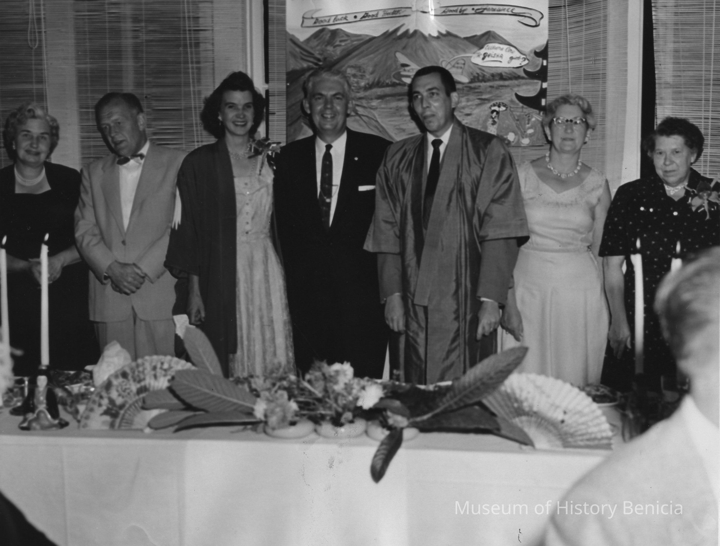 B/W Photograph: seven men and women behind table. Blurry figure in lower right corner. On wall behind is a painting of a volcano with banner reading "Good Luck / Good Health! Goodbye / Farewell." "BA" on back in ink.