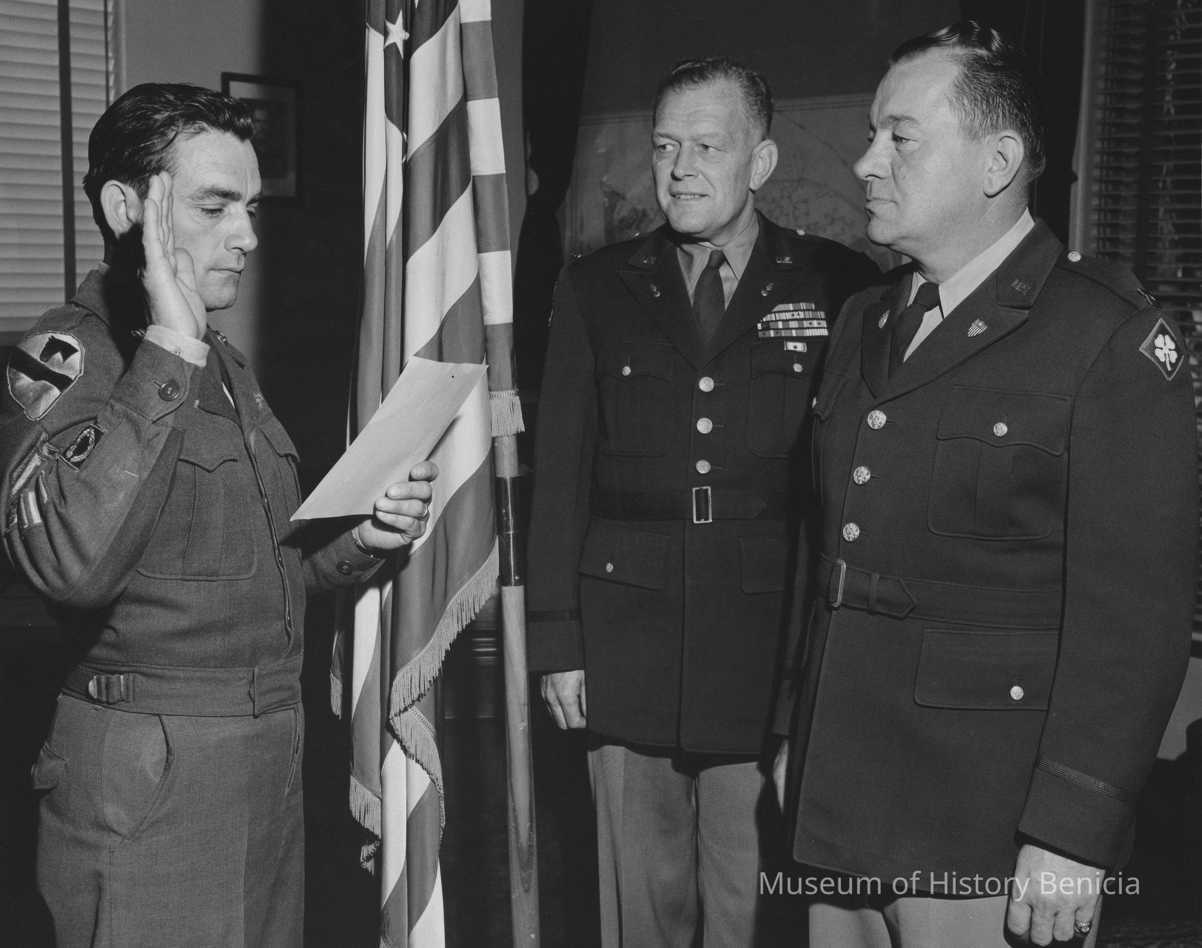 B/W Photograph: one man taking an oath, right hand raised. In the center is Colonel Lawther. American flag behind. On back: "04071-242-1 / AM-55".Collection