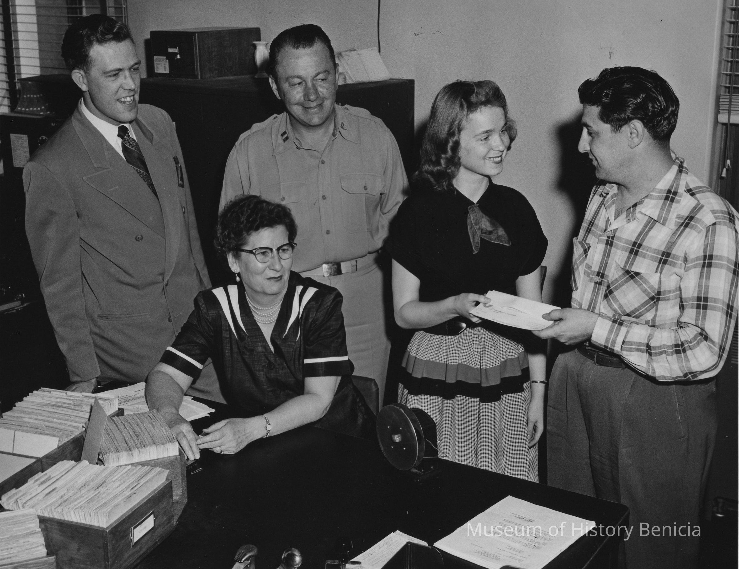 B/W Photograph: young woman being presented with papers by young man, two men are standing nearby and a woman is sitting at a desk. On back: U.S. Army stamp.Collection